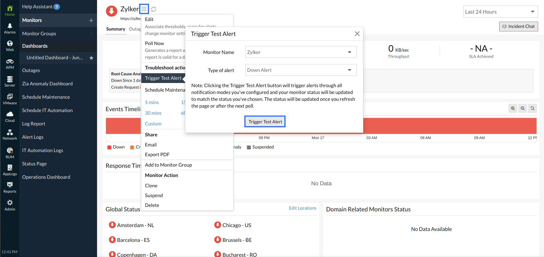 Opting to trigger test alerts by clicking the Trigger Test Alert button will help you to receive alerts through all the notification modes configured for a monitor. This alert will be added to audit logs and alert logs. Once the button is clicked, the status will be updated to match your status preference for the test alert and will be updated once you refresh the page or after the next poll. The notification modes will include email, escalation alerts, SMS, calls, chats, push browser and mobile) notifications, and third-party tools.