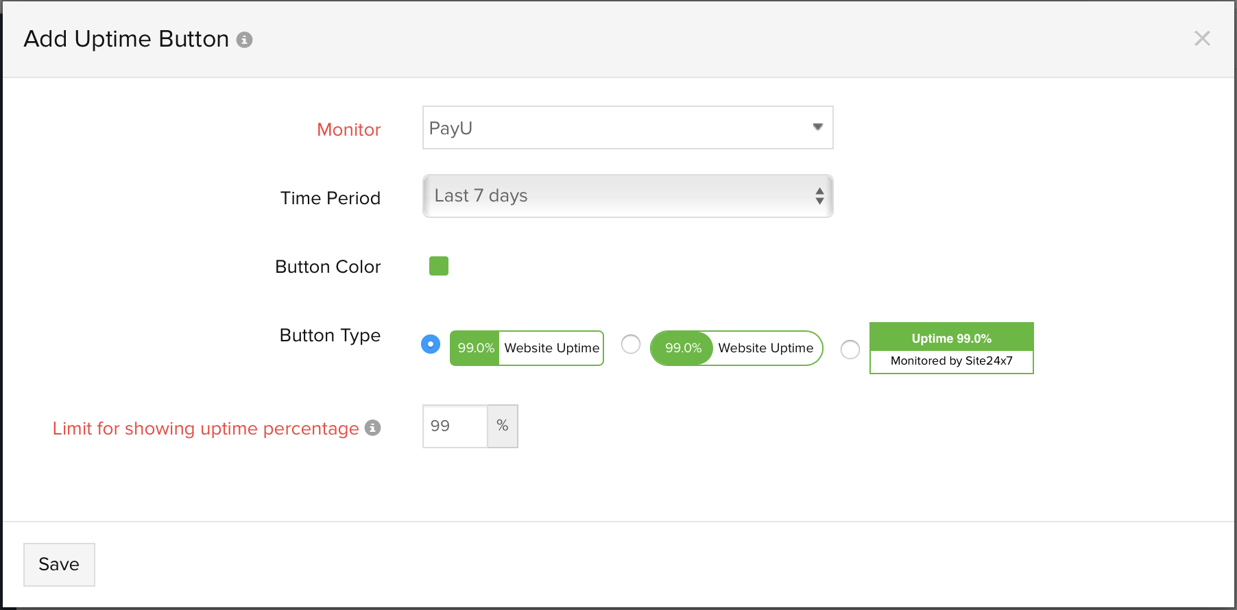 • Your uptime button: Shows the uptime button, which you have created. You can get a preview of the chosen design and color of your configured uptime button.