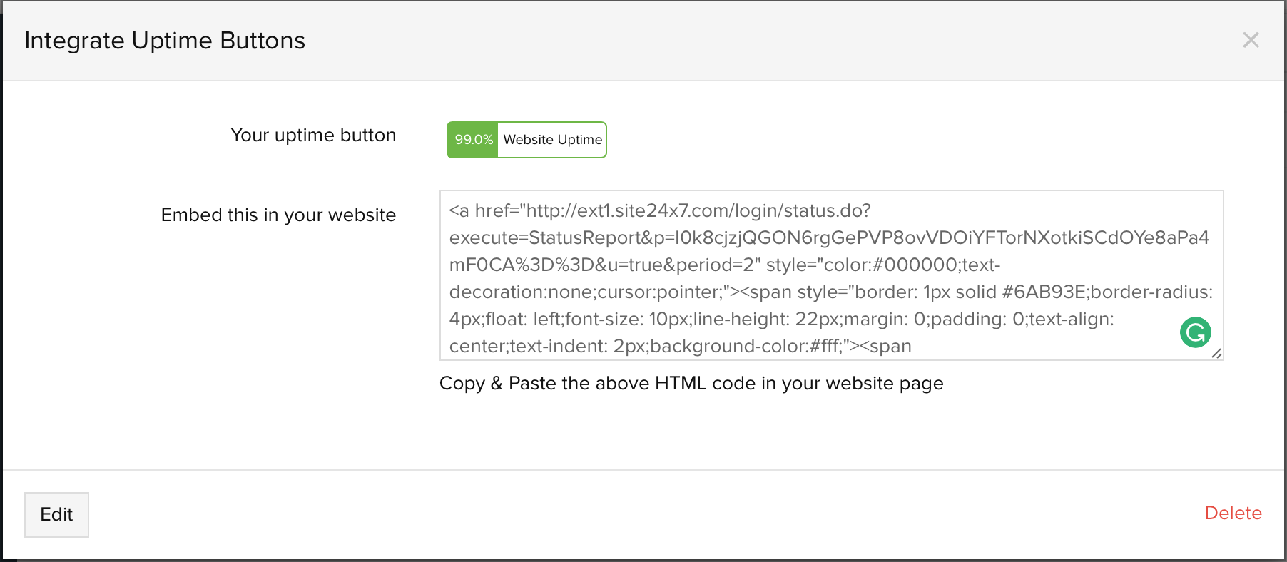 • Embed this in your website: Copy and paste the button code onto your web page to display the Uptime Button feature in your website.
