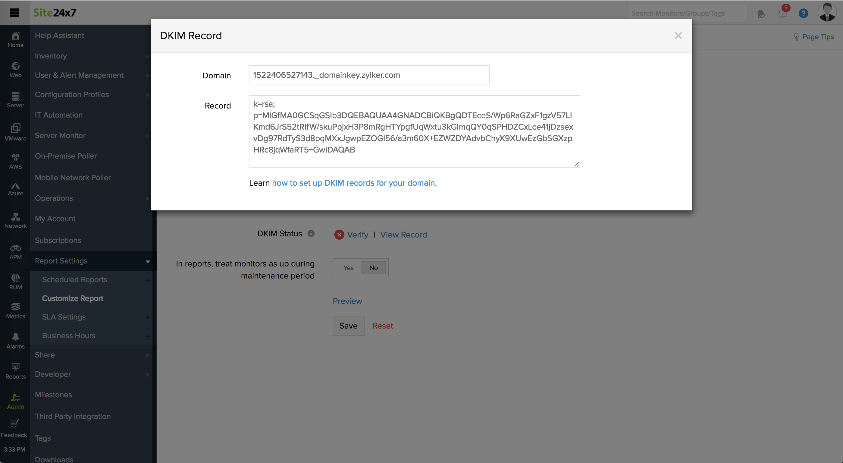 - DKIM Status: You can ensure secure delivery of your email reports by enabling DKIM authentication for your Sender Email address. You must update your DNS zone file with the relevant DKIM records provided by Site24x7 for the domain. Learn how to set up DKIM authentication for your domain.