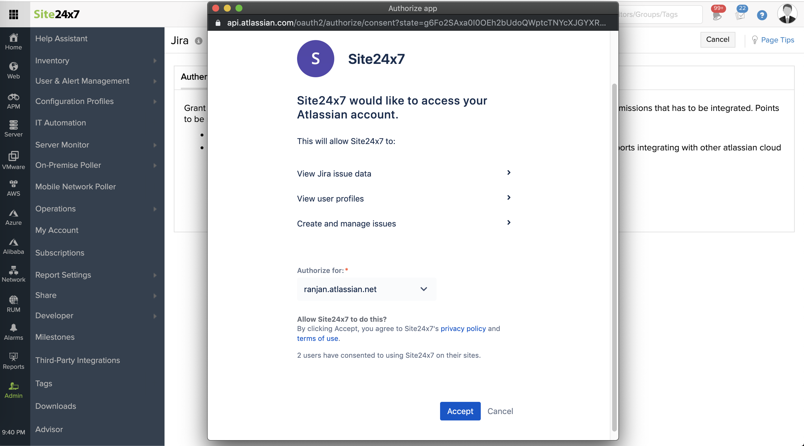 - After clicking Accept, you will be redirected to the Site24x7 web client.You'll then be redirected to the Jira web client in Site24x7.