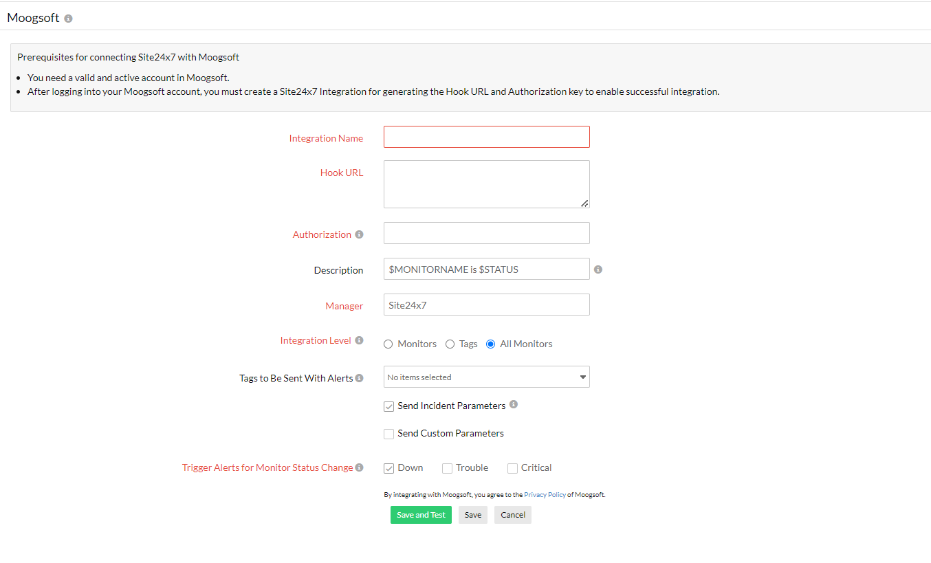 • Integration Level: You can post status alerts and RCA links to Moogsoft from specific monitors, all monitors or monitor groups associated with selected tags, or all monitors in your account. This field is set to All Monitors by default for true global integration, where all alarms from your Site24x7 account are pushed to Moogsoft.