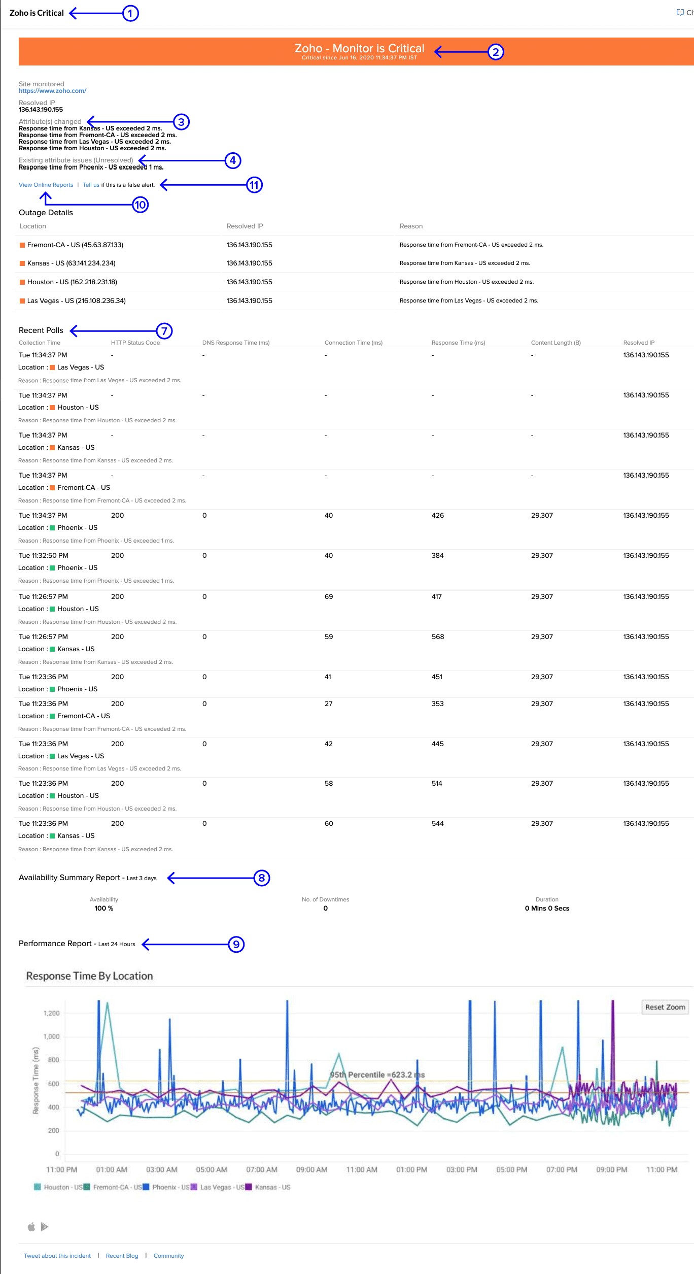 11. Tell us if this is a false alert: You can also submit a report if you feel that the current alert is false. This page will also provide data available from Site24x7 to substantiate why the resource was confirmed as down.
