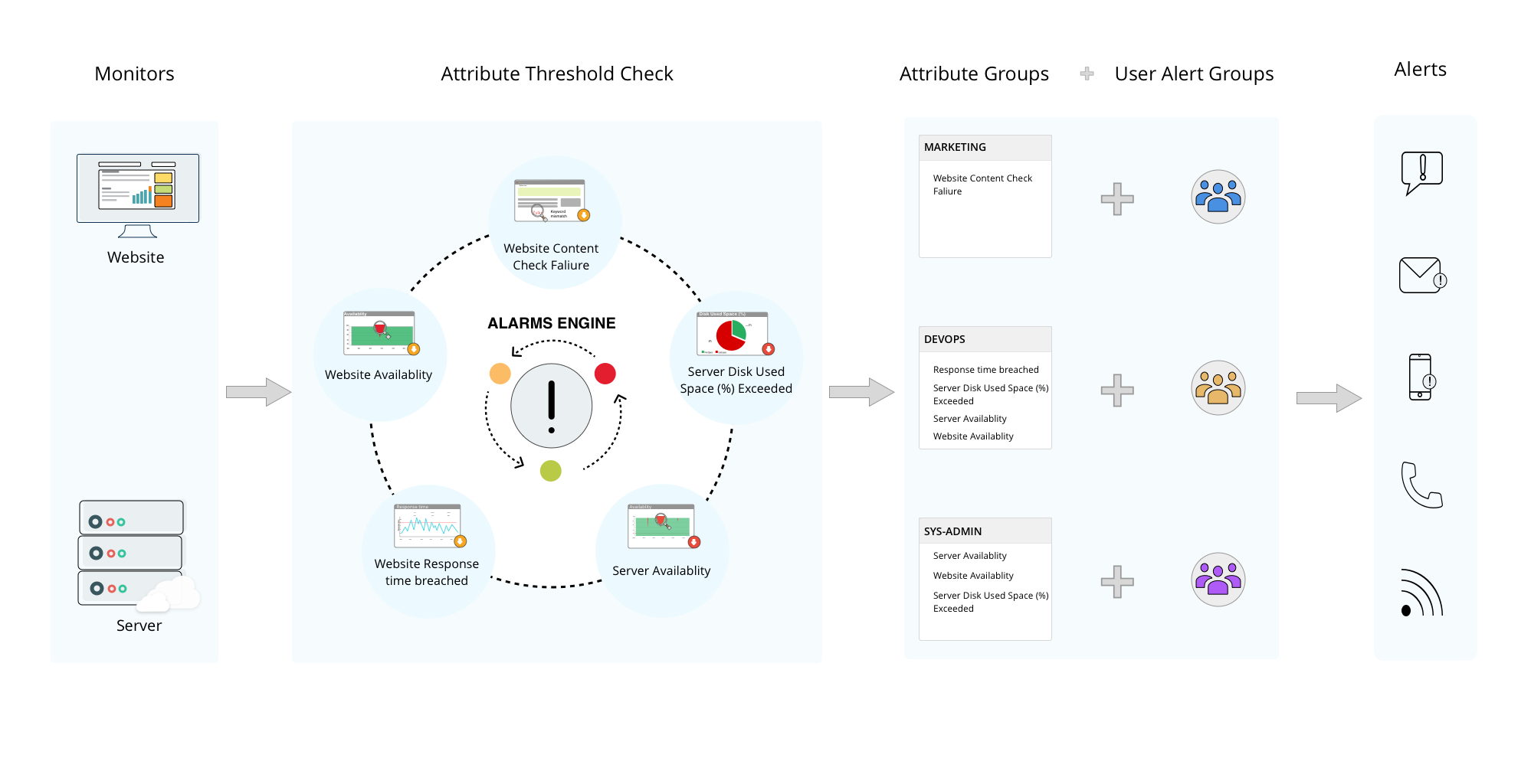 Ideally, you’ll want to receive alerts only when the set threshold value had been breached for these Server Monitor attributes. Once the Attribute template is created, associate the template with your preconfigured User Alert Group “DevOps team” (which in turn is linked with your Server monitor). The next time, your Server monitor encounters an outage, the Alarms engine will first and foremost verify whether any of the attributes listed in the DevOps Template had triggered the outage. If it finds this to be true, an alert is triggered immediately to the DevOps team. However, if the outage wasn’t due to any of the above-listed attributes, alerts get automatically suppressed. Even then, the incident does not get lost as it gets logged in the Alert log with the record "monitor name + "has no contacts configured to receive alerts for:" + attribute name". Thus, you can create unique attribute based alerting templates and associate it to your alerting group to customize your Alerting policy.