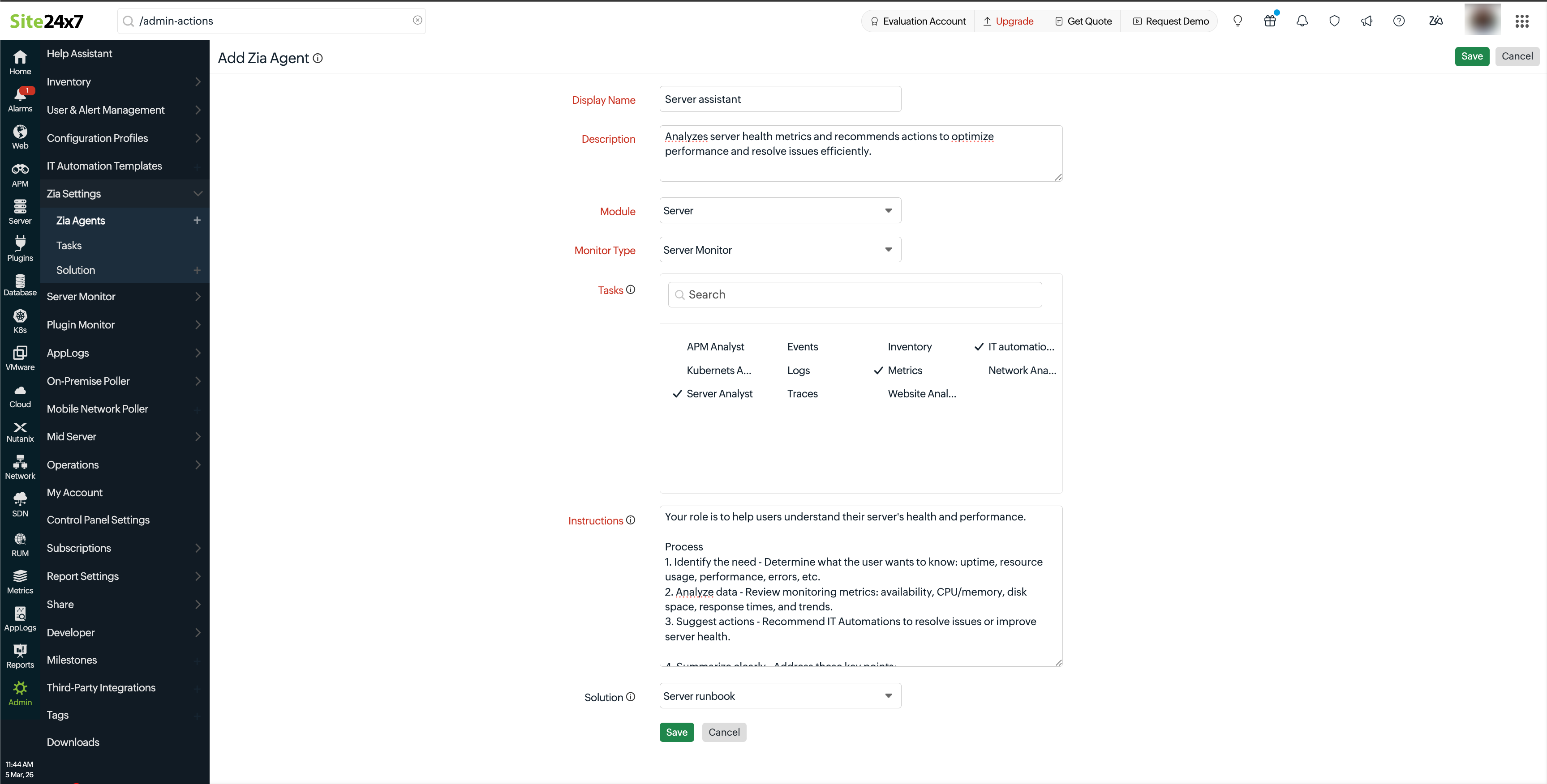 Zia Agents in Site24x7 enables intelligent, workflow-driven operations by combining AI insights with automated execution. These agents act on monitoring data using predefined or custom instructions, helping teams respond faster and more consistently to operational scenarios.