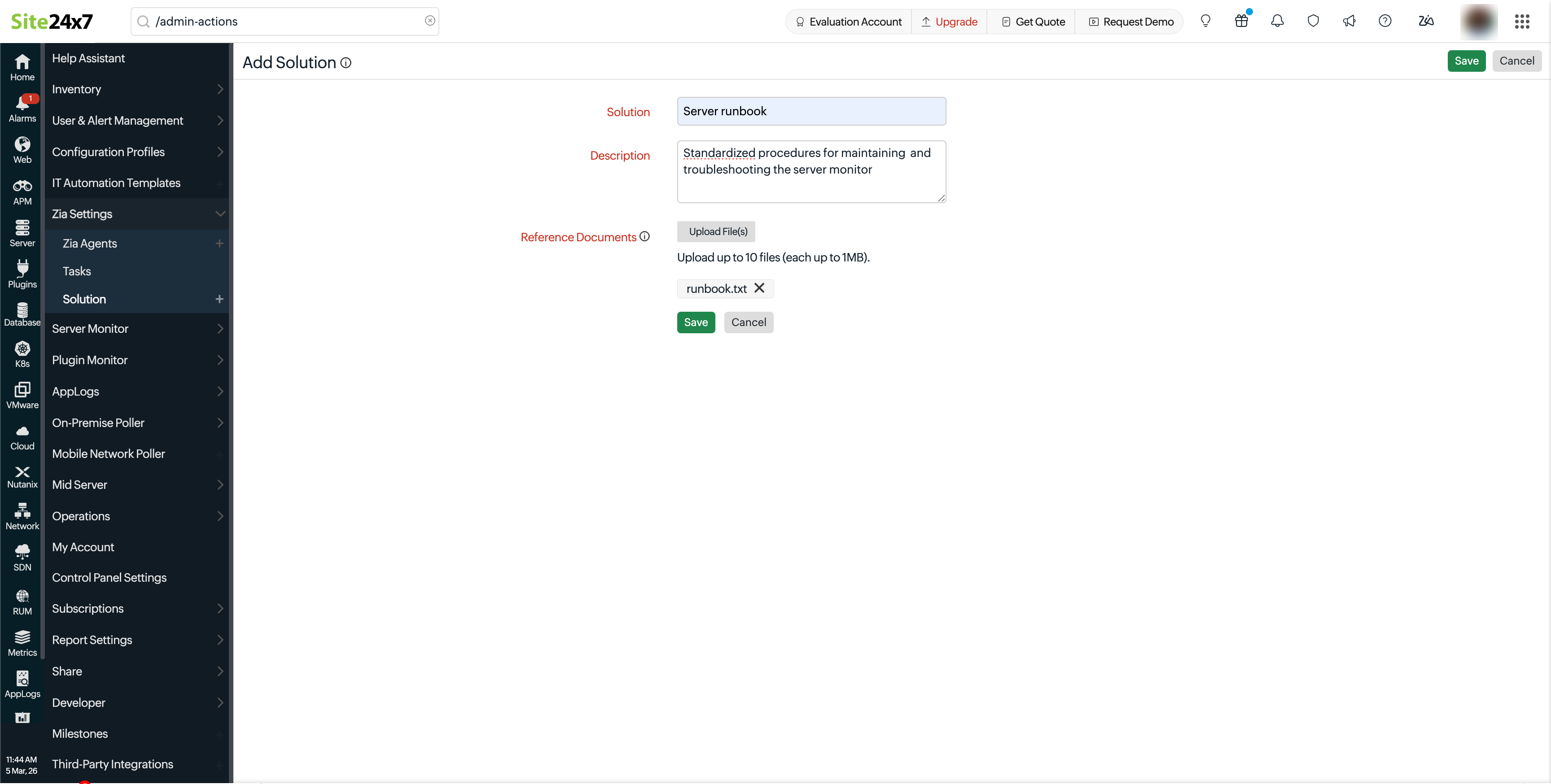 Zia Solutions is a feature that allows users to upload structured runbooks and troubleshooting documents that can be referenced by the Zia Agent during incident analysis and remediation workflows. These uploaded documents act as contextual guidance, enabling Zia to align its automated diagnostics and recommendations with your organization’s predefined operational procedures.