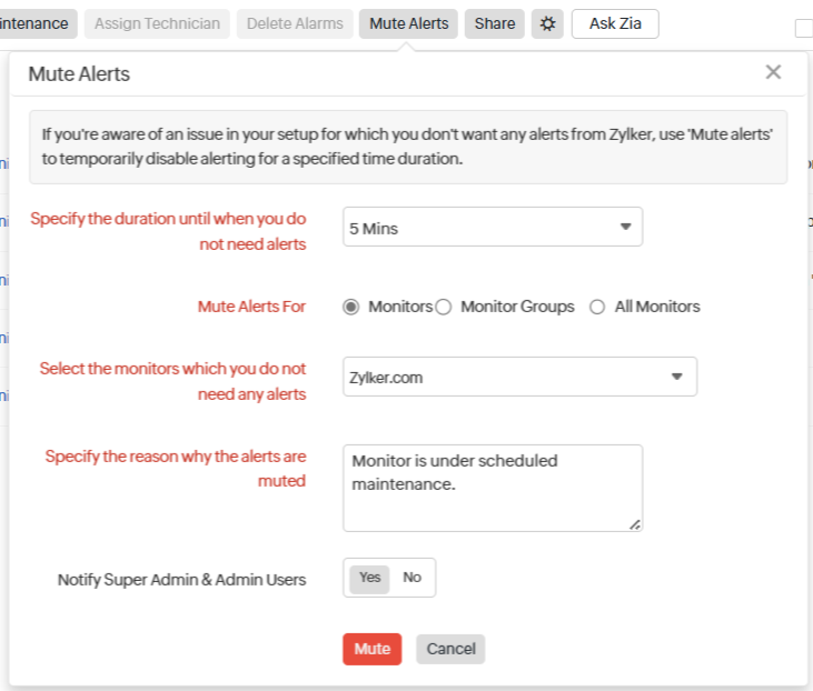 You have the complete freedom to customize alerts muting. You have to pick the relevant resources (selected monitors, monitor groups, or all the resources in the account), select a time frame ranging from five minutes to a day and then finally provide the relevant reason for suppressing alerts before clicking the Mute button. At any point of time, you can decide to extend the mute period or even decide to unmute all the alerts. Only a Super Admin/Admin user will have the rights to mute alarms.