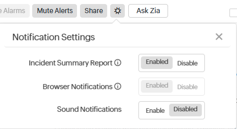 An email, Incident Summary Report, consolidating the summary of all the incidents for the monitor along with comments added by the users will be automatically sent out to the technician and all contacts in the User Alert Group.If you do not wish to receive this email, click on the settings icon beside the Mute Alerts button and disable this preference. Disabling this preference would trigger an email only to the technician. On the other hand, if this option is enabled, an email would be sent to the technician and all the contacts in the User Alert Group. This preference can be set only by a Site24x7 Super Admin or Site24x7 Admin.