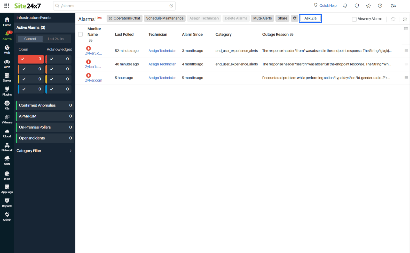 Click the Ask Zia button to connect with Zia in Site24x7.