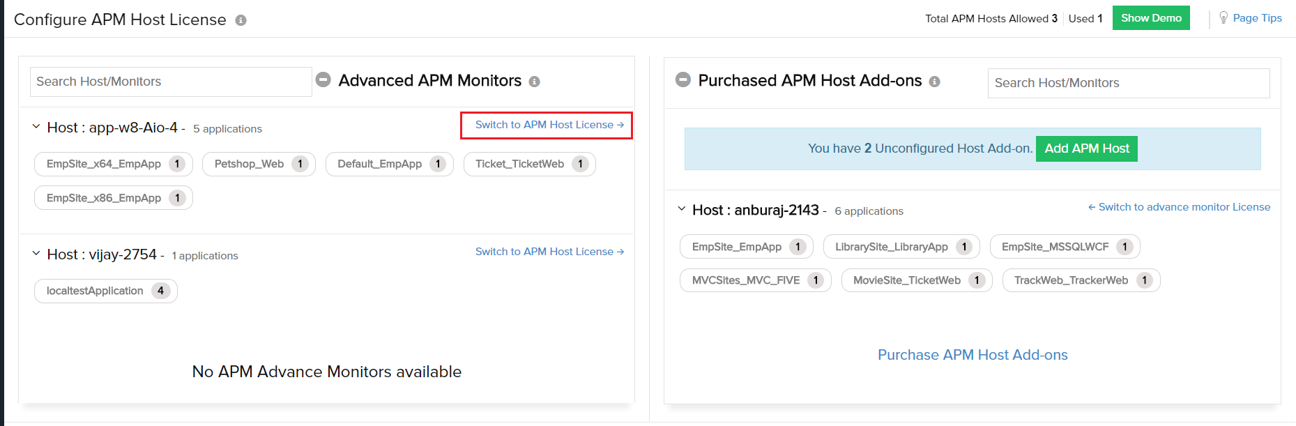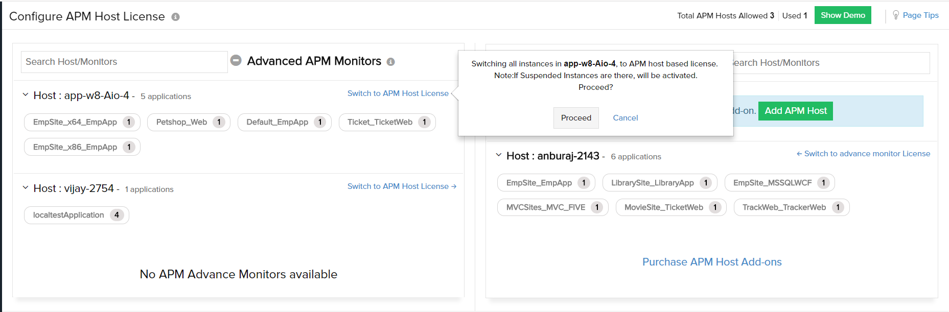- From the Configure APM Host License page, choose the host(s) you wish to convert and click Switch to APM Host License.