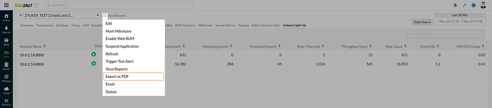 Click on this hamburger icon (Hamburger icon) and select Export as PDF to export the Instance metrics report.