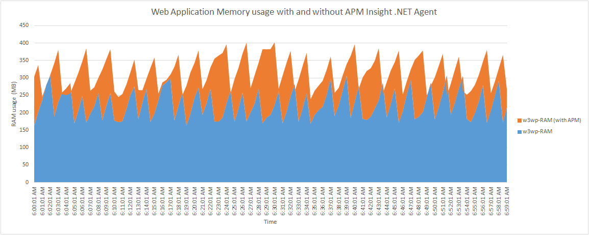 The APM Insight .NET Agent by default collects performance data and pushes it to its own service, every minute, and hence, the footprint on the user memory is minimal, and only transient. The important thing to note here is that the memory consumption is directly proportional to the number of data collected in a minute, and so, decreasing the sampling factor or transaction trace threshold comes at a cost of increased RAM usage. However, with the default production settings, (sampling factor=5, trace threshold=2 sec, sql trace threshold=3 sec) the memory will not exceed 90 MB, even during peak load. The below table summarizes the details.