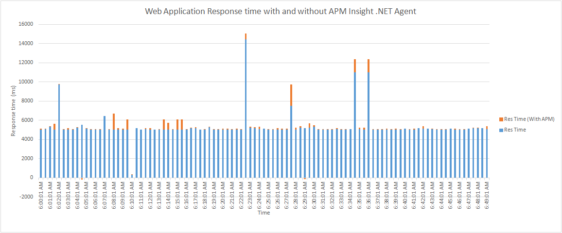 The APM Insight .NET Agent only instruments framework methods by default, and hence the overhead on response time is minimal. On an average, the response time variation due to the agent is around 30 ms. The response time variation during peak response times was around 500 ms. The same is summarized below.