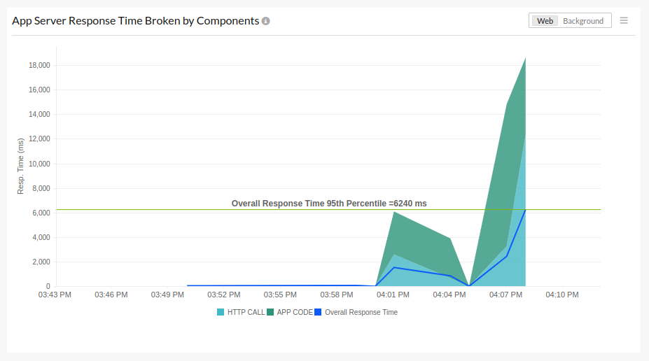 On the APM Overview page, check the App Server Response Time Broken by Components graph. The asynchronous activity in the respective Java application can result in the response time (dark blue line) being less than the total transaction time.