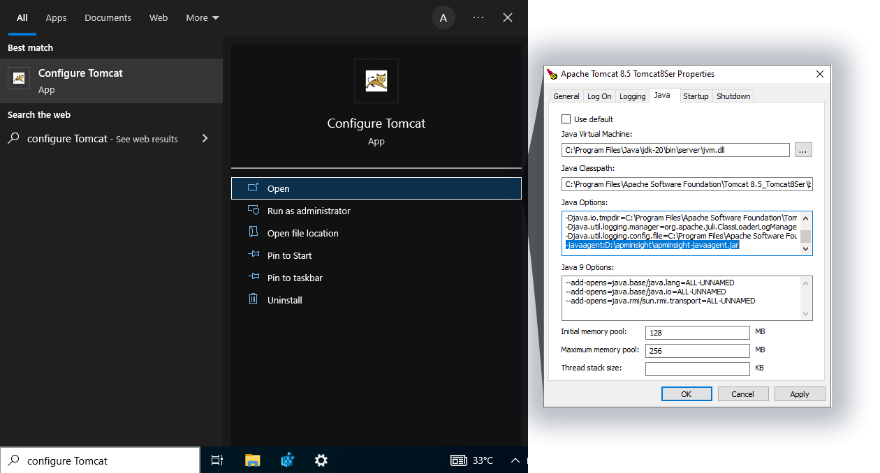 NoteIf you are unable to find the Configure Tomcat app (for the desired Tomcat server) in Windows search, navigate to the Tomcat bin directory and then double-click on the Tomcat<version>w.exefile.