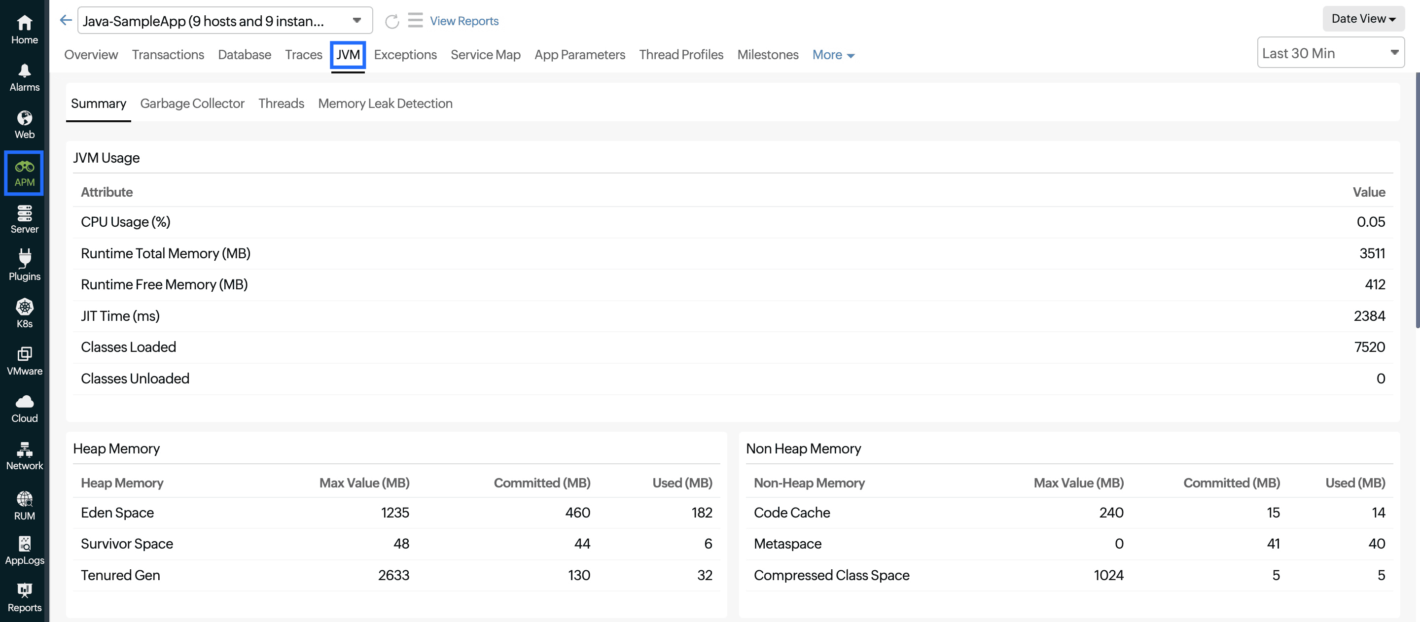 - Navigate to APM, select your Java application, and click the JVM tab.