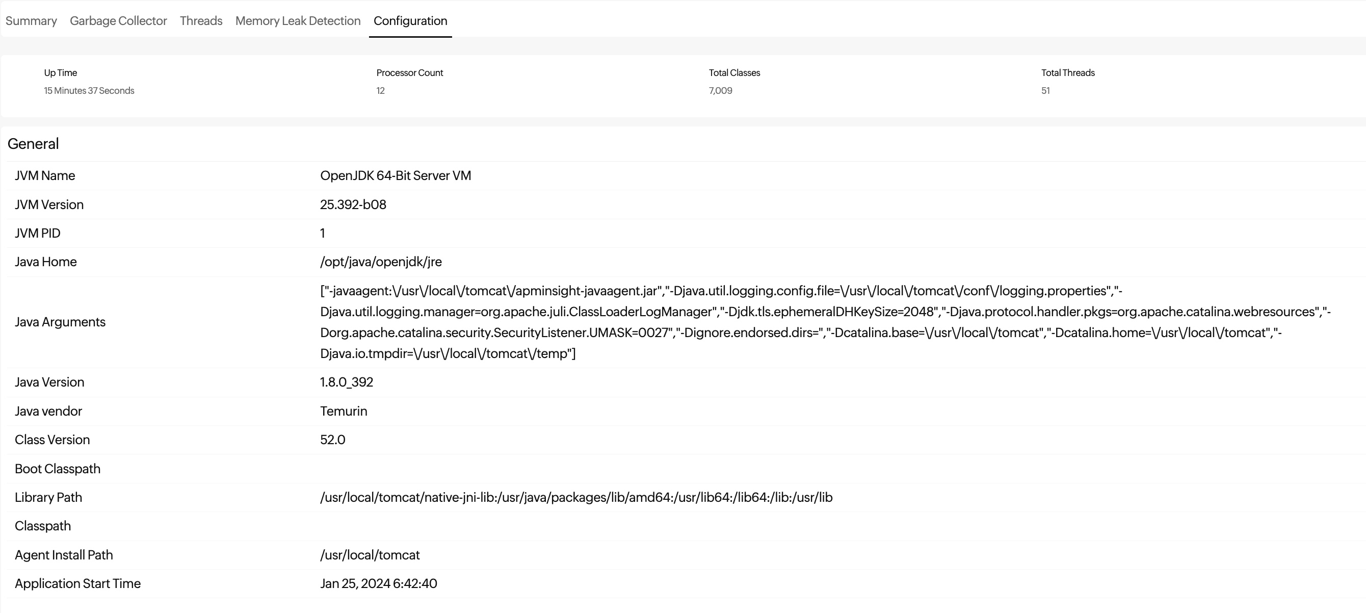 | Java Arguments | The list of arguments passed to the JVM during startup, including various configurations and properties |