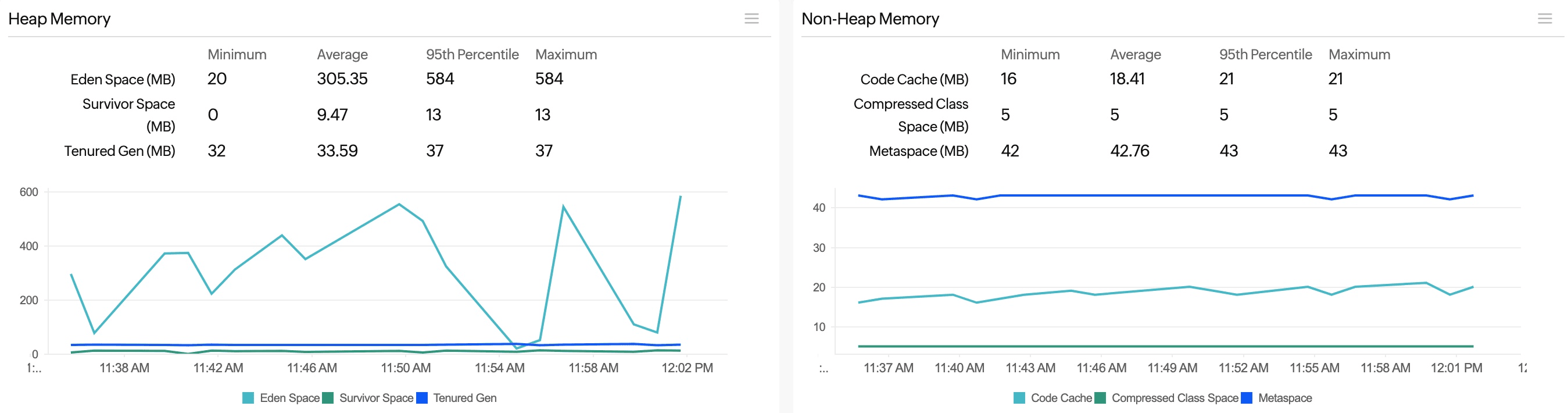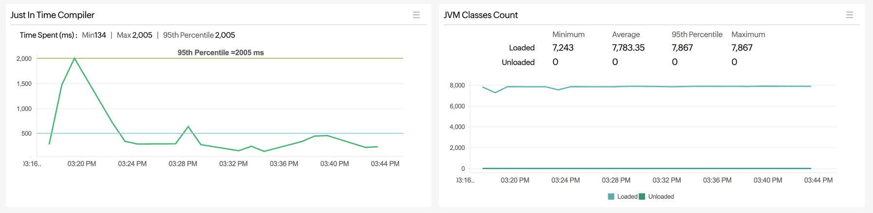All visualizations available on the JVM tab include indicators for the maximum, minimum, 95th percentile, and average values. These indicators provide users with a quick overview of the JVM's performance across various aspects.