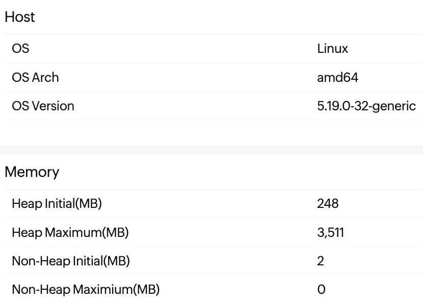 This tab provides a basic level of information, including metadata about the JVM of the current instance and the host environment.