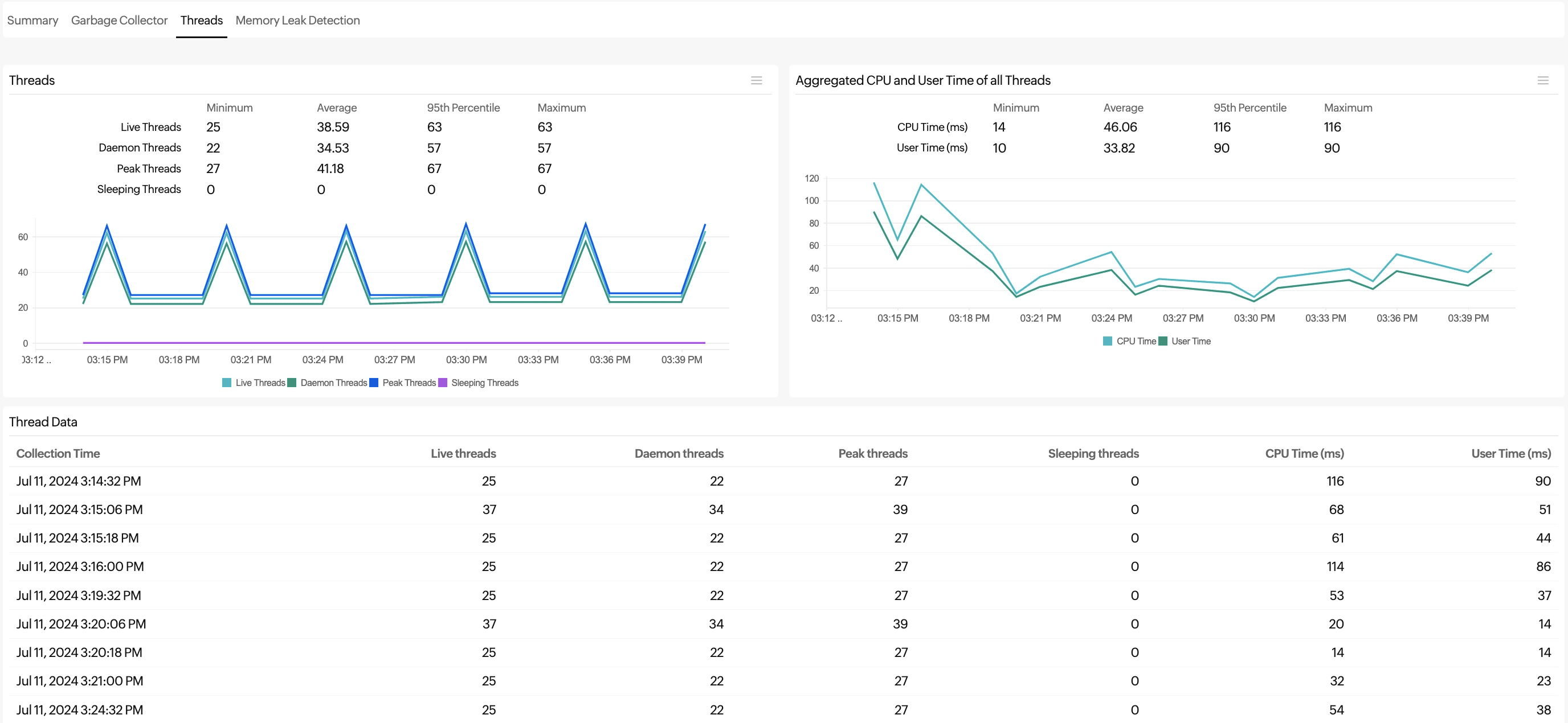 This graph shows the total CPU and user time consumed by all the threads over the observed period.