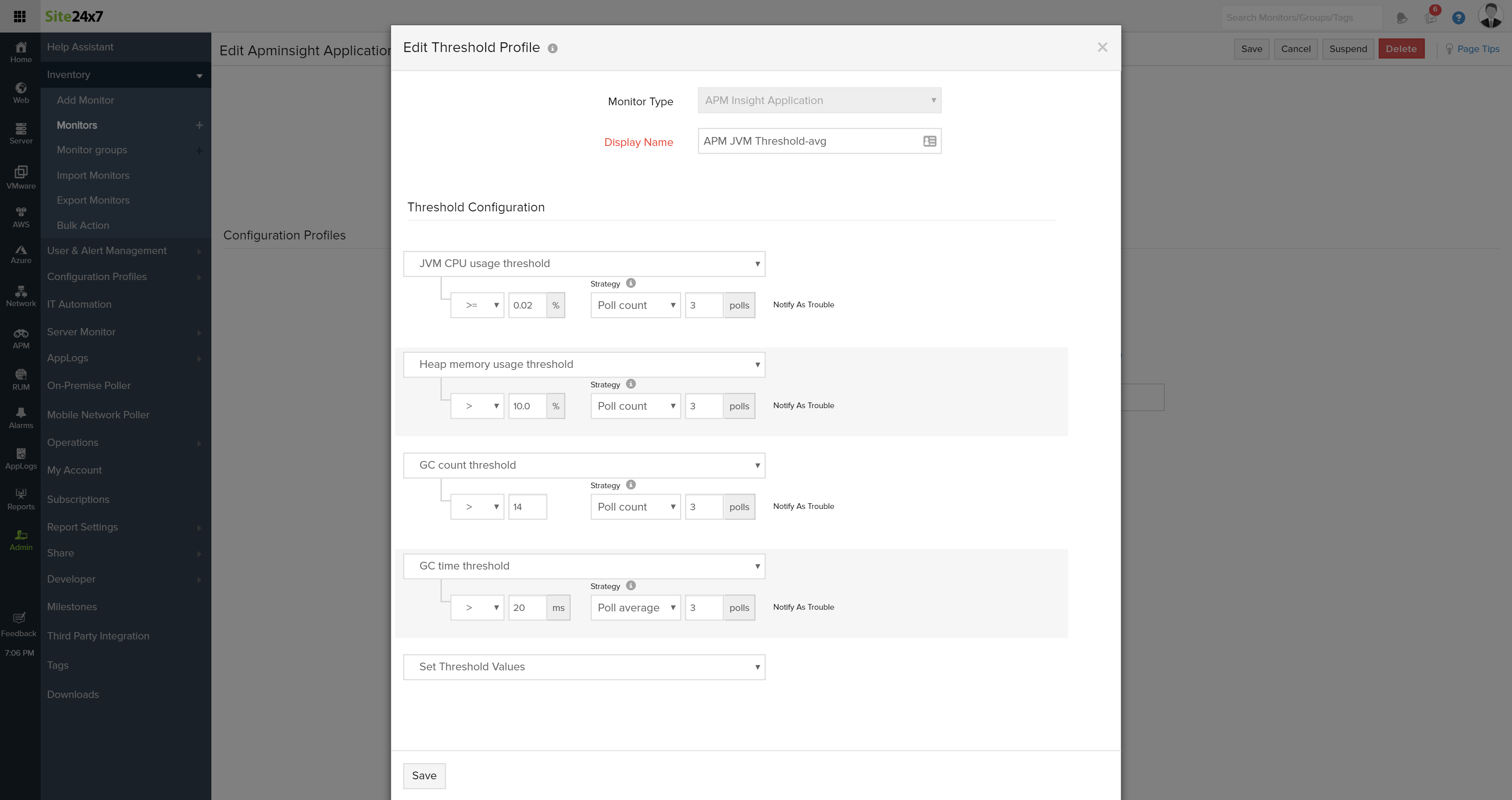 JVM metrics is polled every five minutes. You can set threshold values for the above mentioned parameters and choose to get alerted based on poll frequency or poll average.