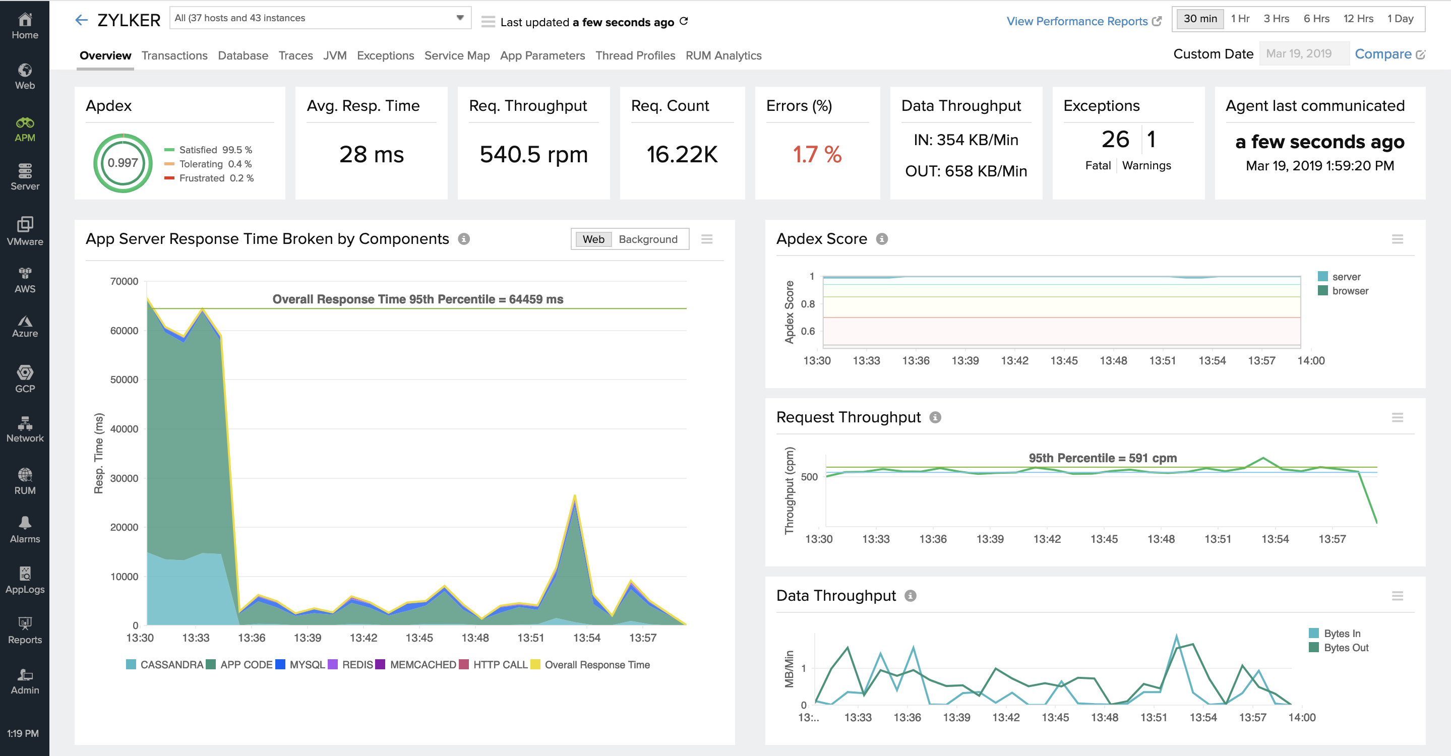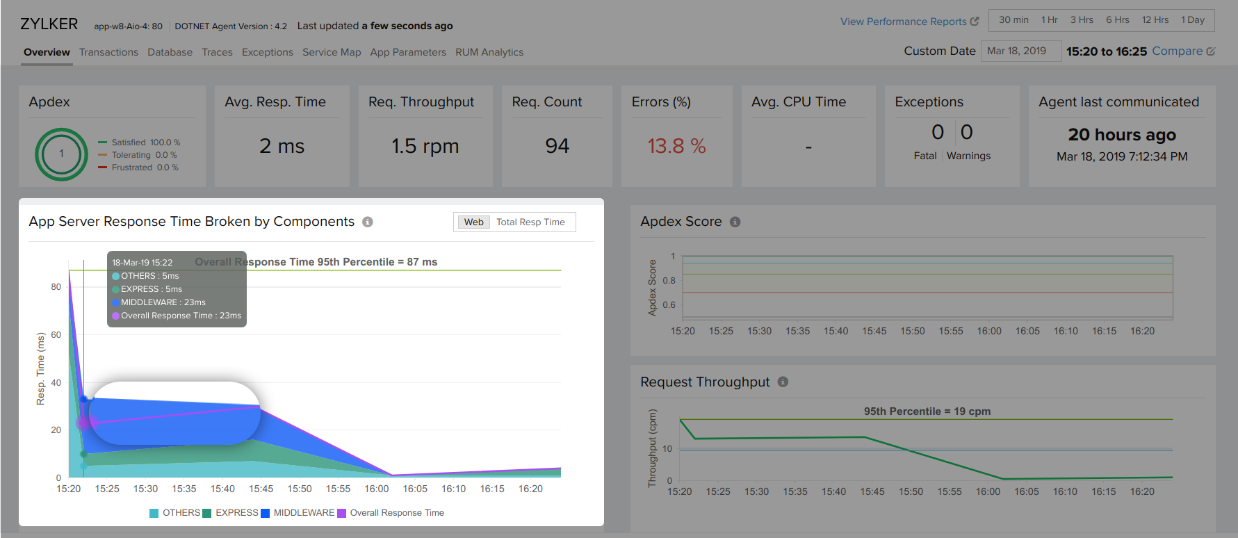 Note: The maximum number of unique components tracked by the agent is 15. If the component count exceeds 15, response time of other components are shown as "Others". Also, time spent in waiting for resources, say time taken to initiate a DB request, is included in "Others".