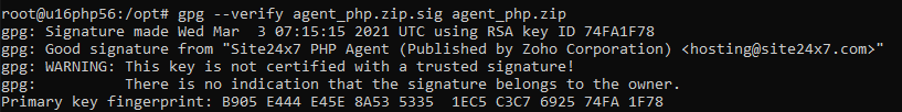 - Download the signature file(agent_php.zip.sig) and verify the downloaded zip with it's signature.