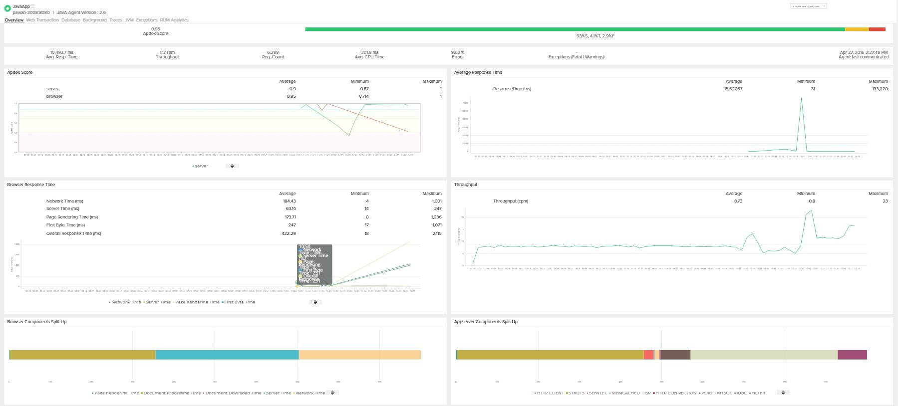 Along with application level metrics, individual transactions performance is also tracked from browser click to browser display of response. This will help in getting the exact split of the transactions response time and will help in fine tuning and identifying the root cause of a transactions behaviour.