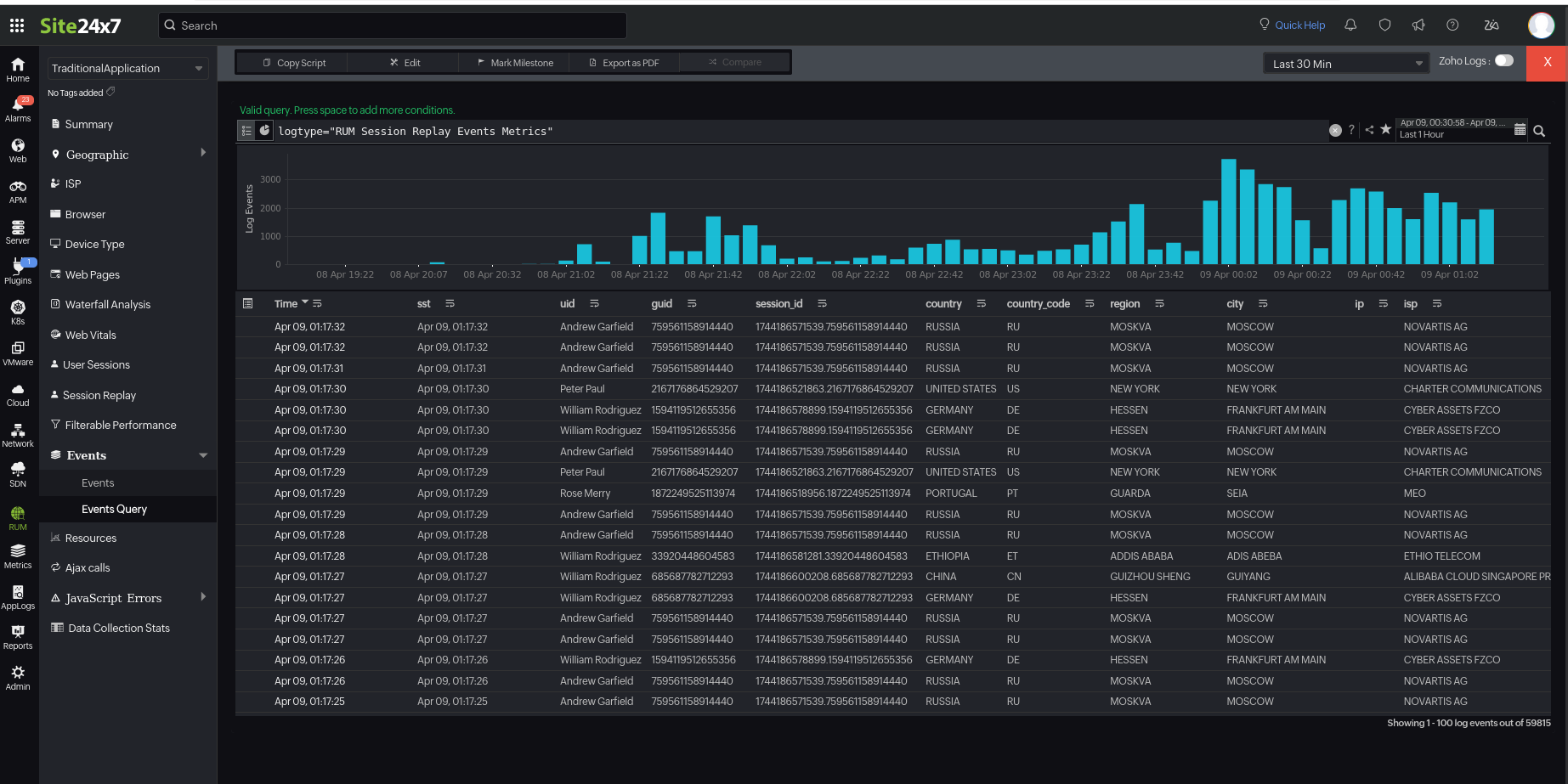 To access this tab, navigate to RUM > Your application > Events > Events Query.