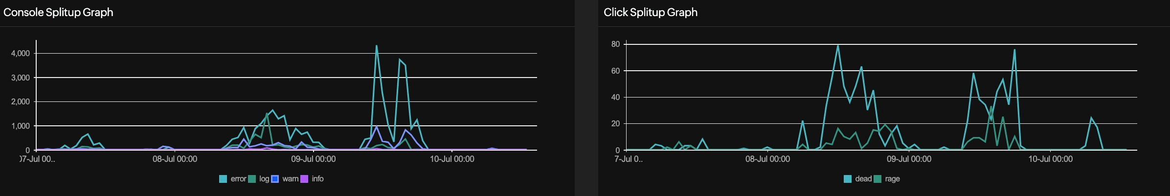 This graph visualizes the distribution of dead clicks and rage clicks over time, showing when and how frequently these clicks occur. This helps in understanding user interaction issues and identifying specific times when problematic clicks are more prevalent.