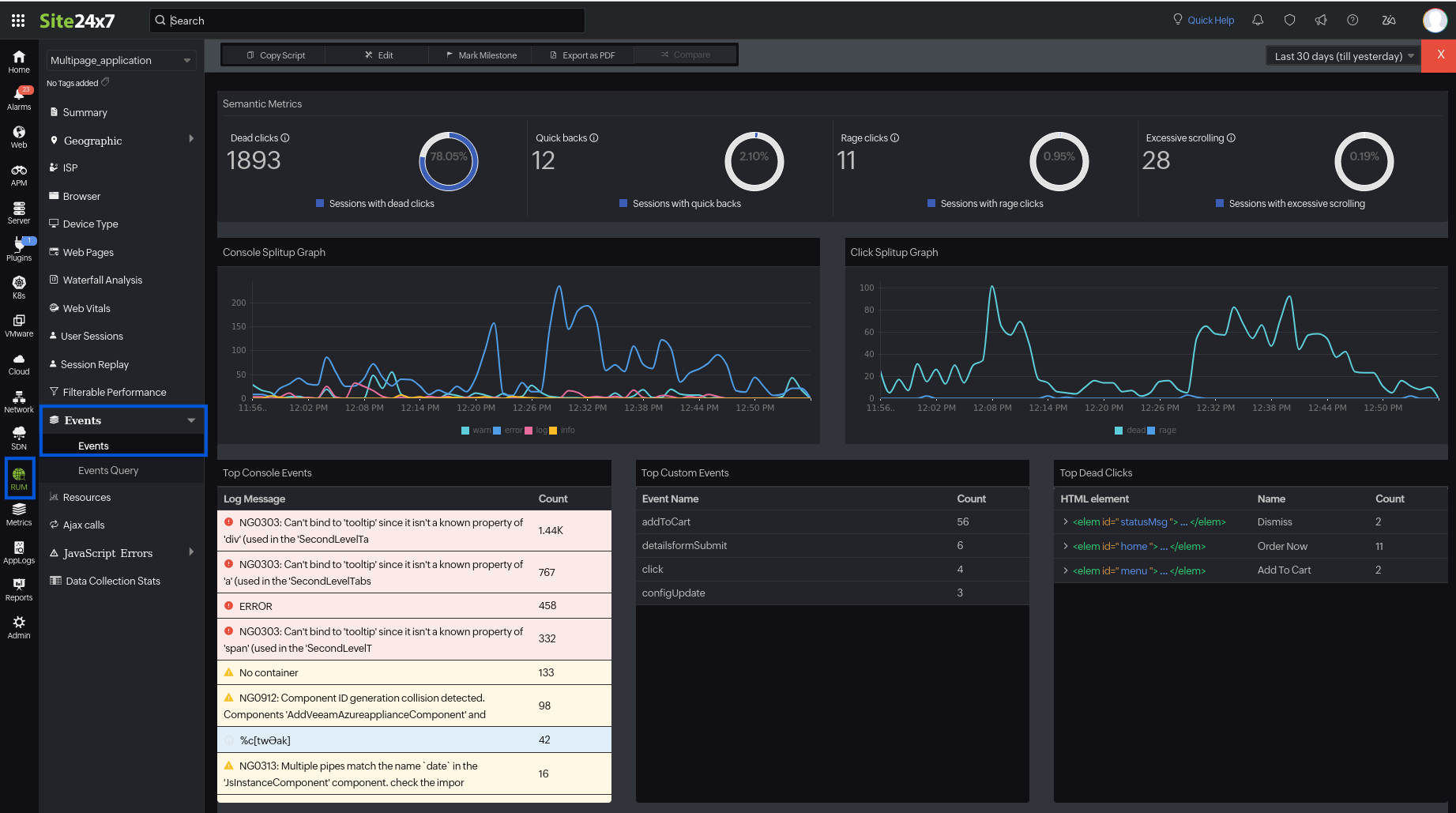 RUM Events provide critical insights into the performance and user experience of your web applications. By tracking real user interactions and key performance metrics—such as dead clicks, quick backs, rage clicks, and excessive scrolling of user sessions—you can identify and address issues that impact your website's functionality and user satisfaction.