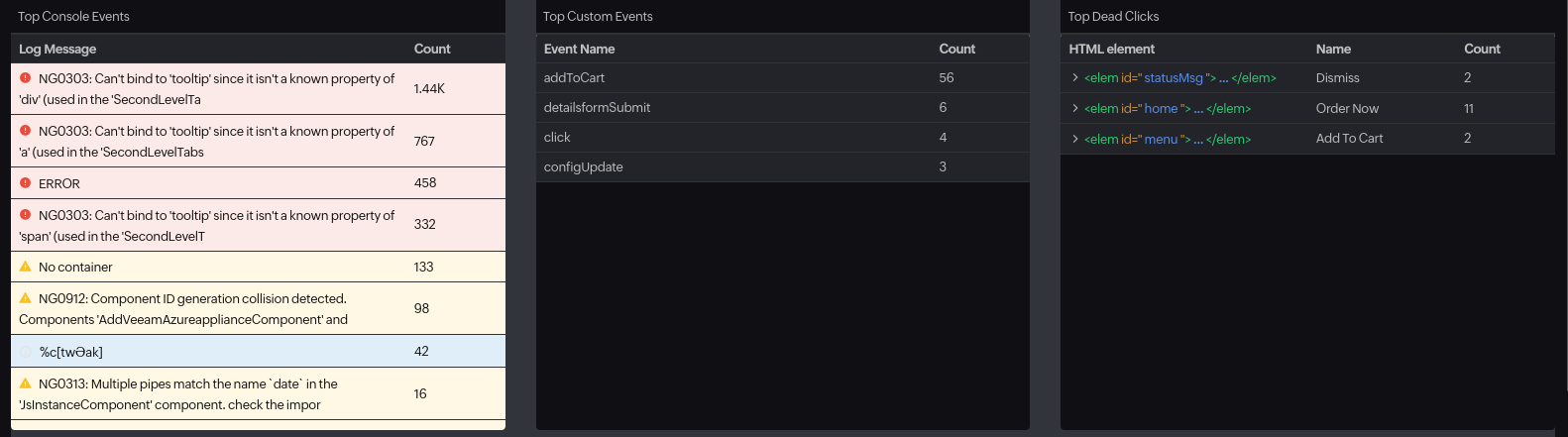 Lists the HTML elements that were most frequently clicked without any response during user sessions. It provides the following information for each element: