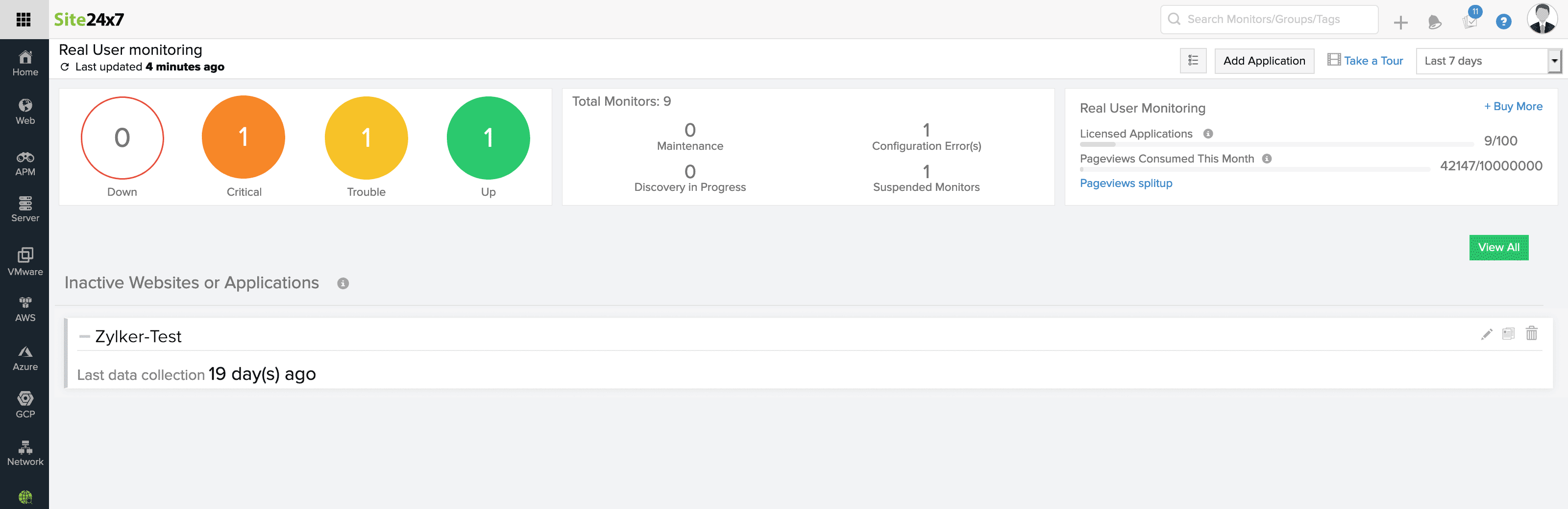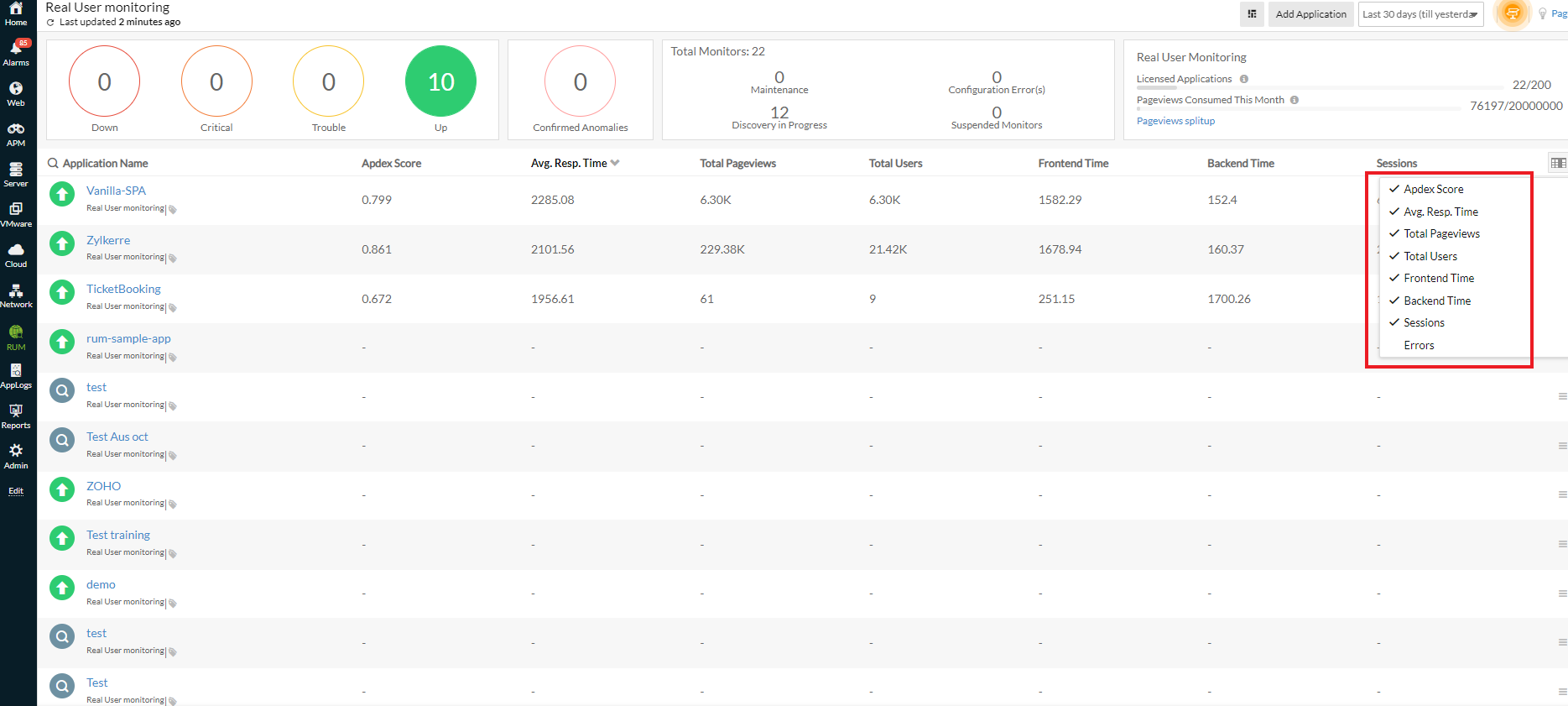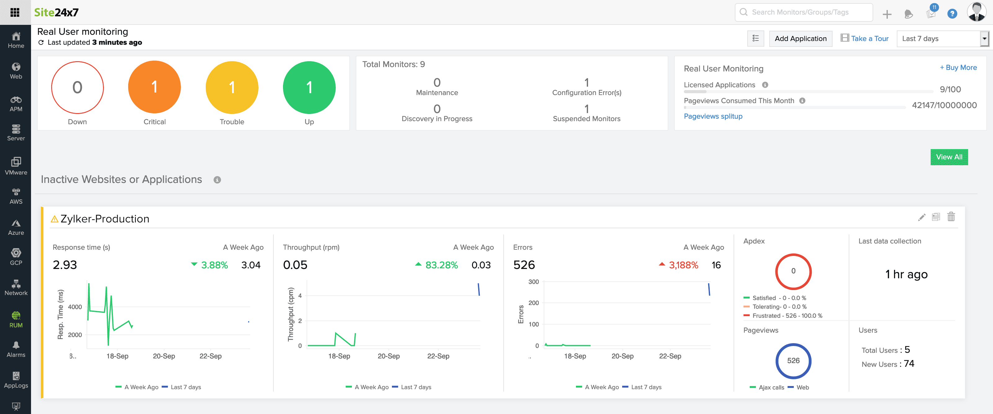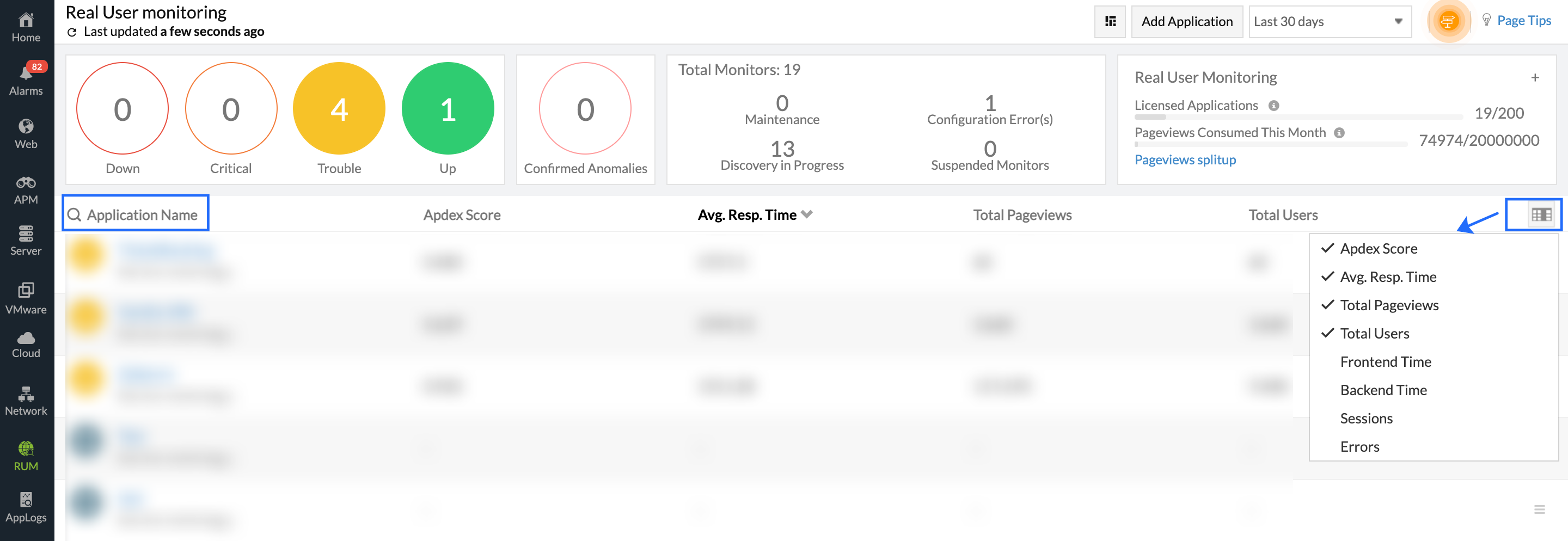 Get a holistic view about the status of your RUM applications with RUM dashboard. RUM dashboard lists all your active, inactive applications along with the ones that are in Trouble, Critical or Suspended state.