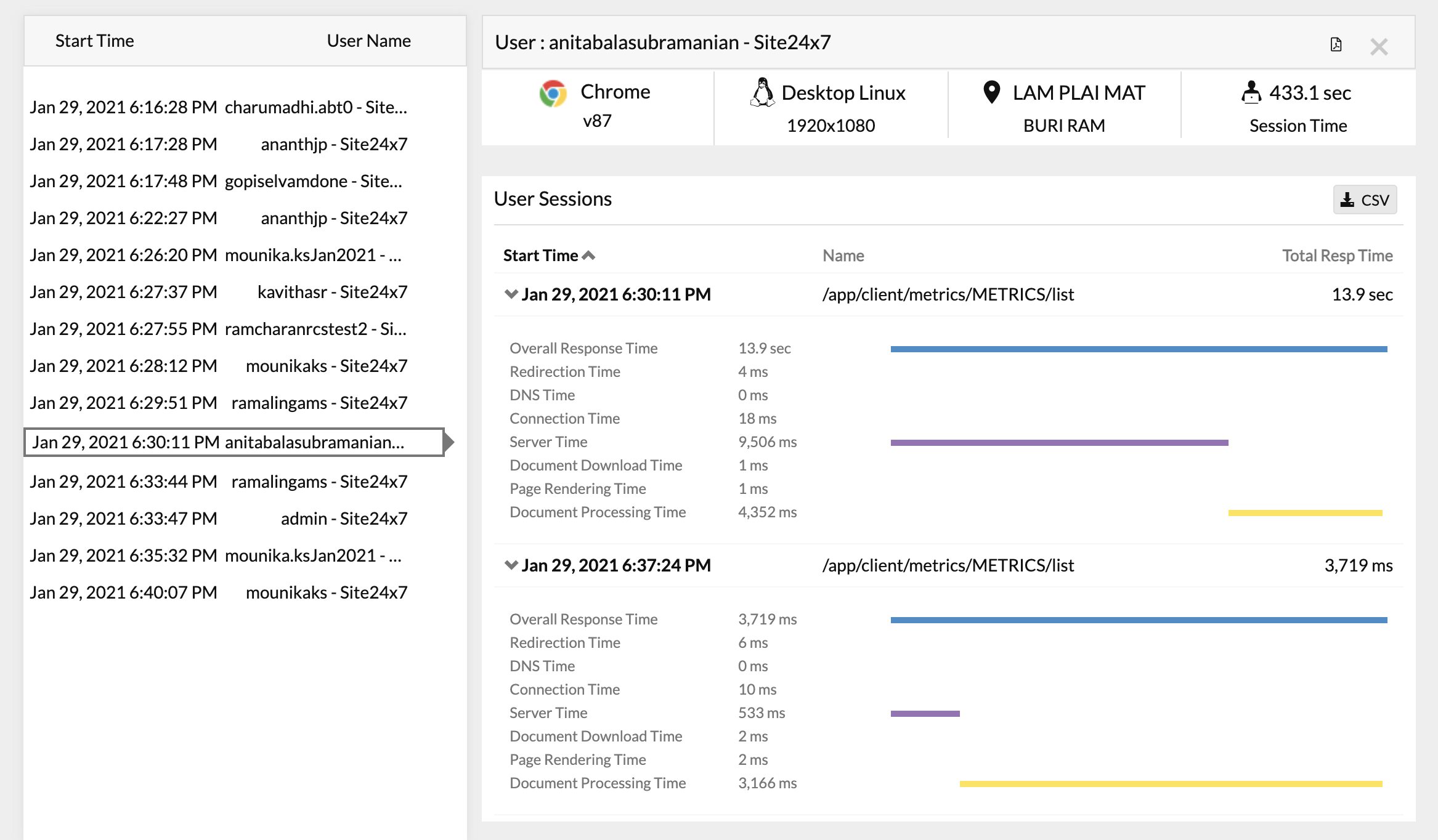 - Click on individual user details to inspect further details like webpages accessed by that user, time taken for each session, and the page loading time of individual pages accessed by the user.
