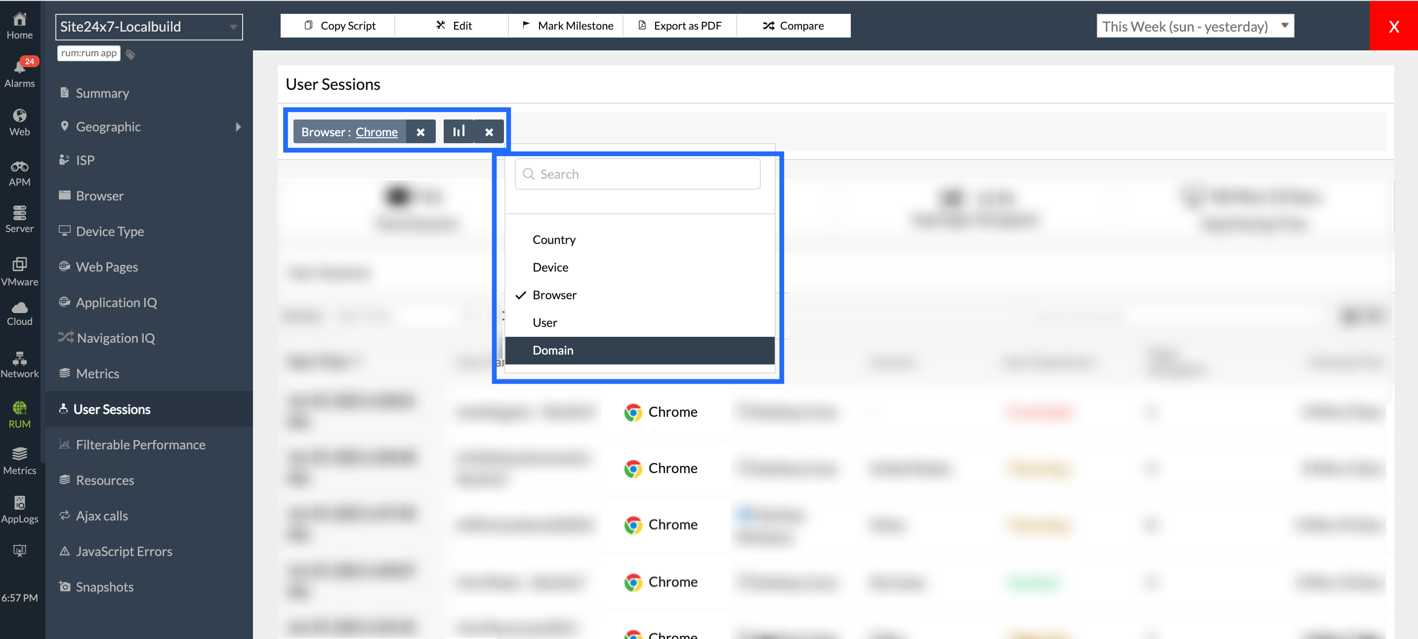 - You can also filter user sessions based on country, device type, browser, user name, ISP, domain, connection type, viewport, device memory, environment, release label, and user experience (satisfied, tolerating, or frustrated). This helps you inspect user-specific or region-specific issues and determine the root cause effectively.