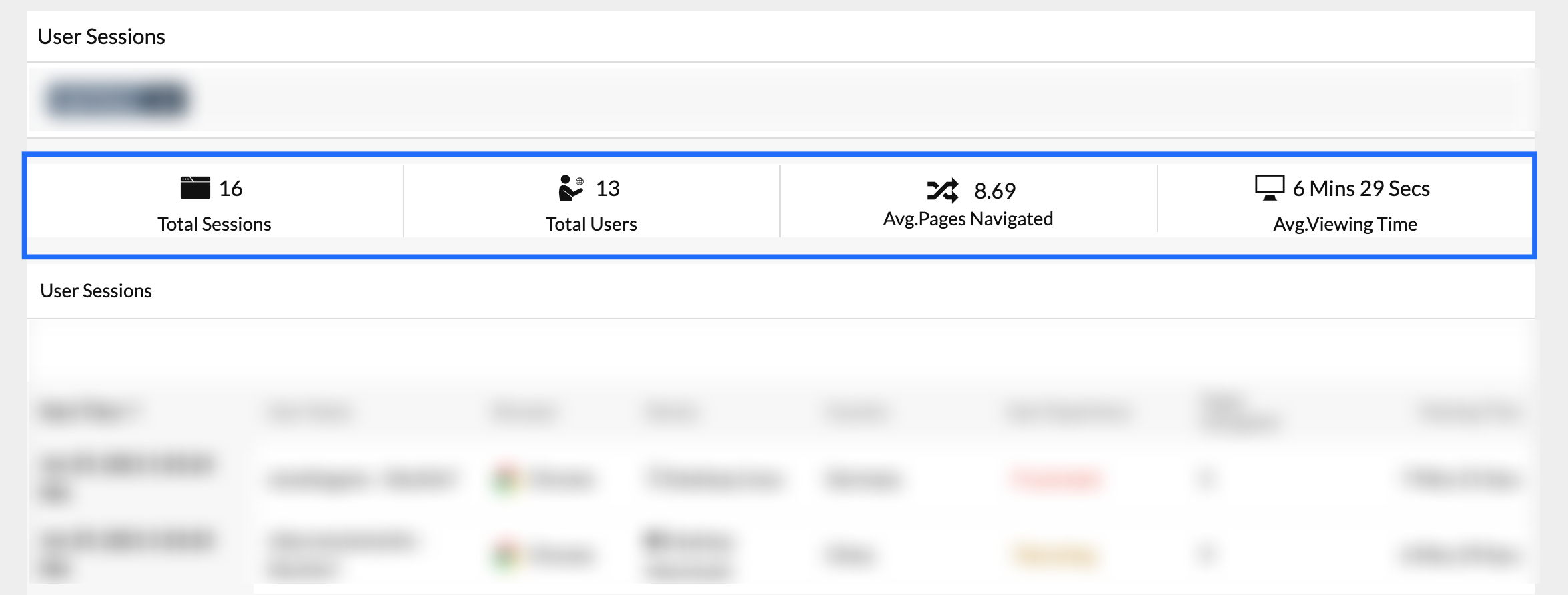 - The top band displays the number of sessions, number of users, average number of pages navigated, and average viewing time.