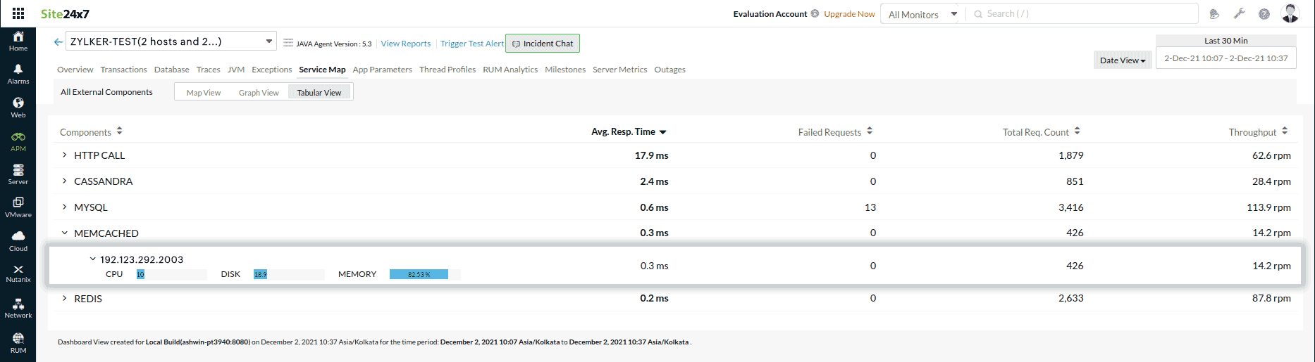 The tabular view lists all the components along with their associated servers. Clicking on an individual server takes you to the corresponding Graph View, and clicking on the metrics bar takes you to the corresponding Server Metrics tab.
