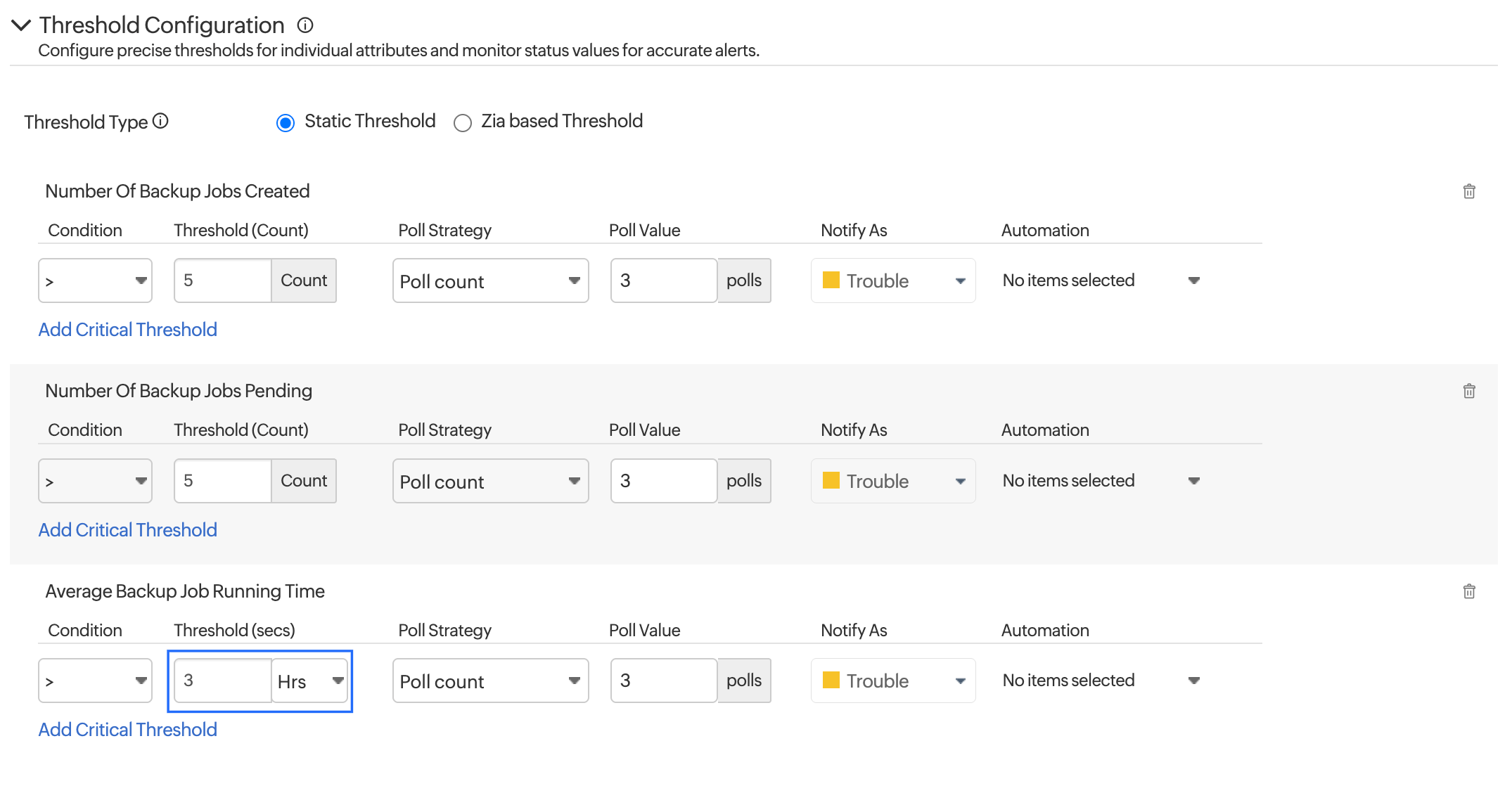The system automatically converts the threshold (3 hours) into milliseconds in the background and compares it with the metric values. The alert will trigger only when the average backup job duration exceeds 3 hours. This makes threshold setup easier, especially for large time values or storage based metrics.