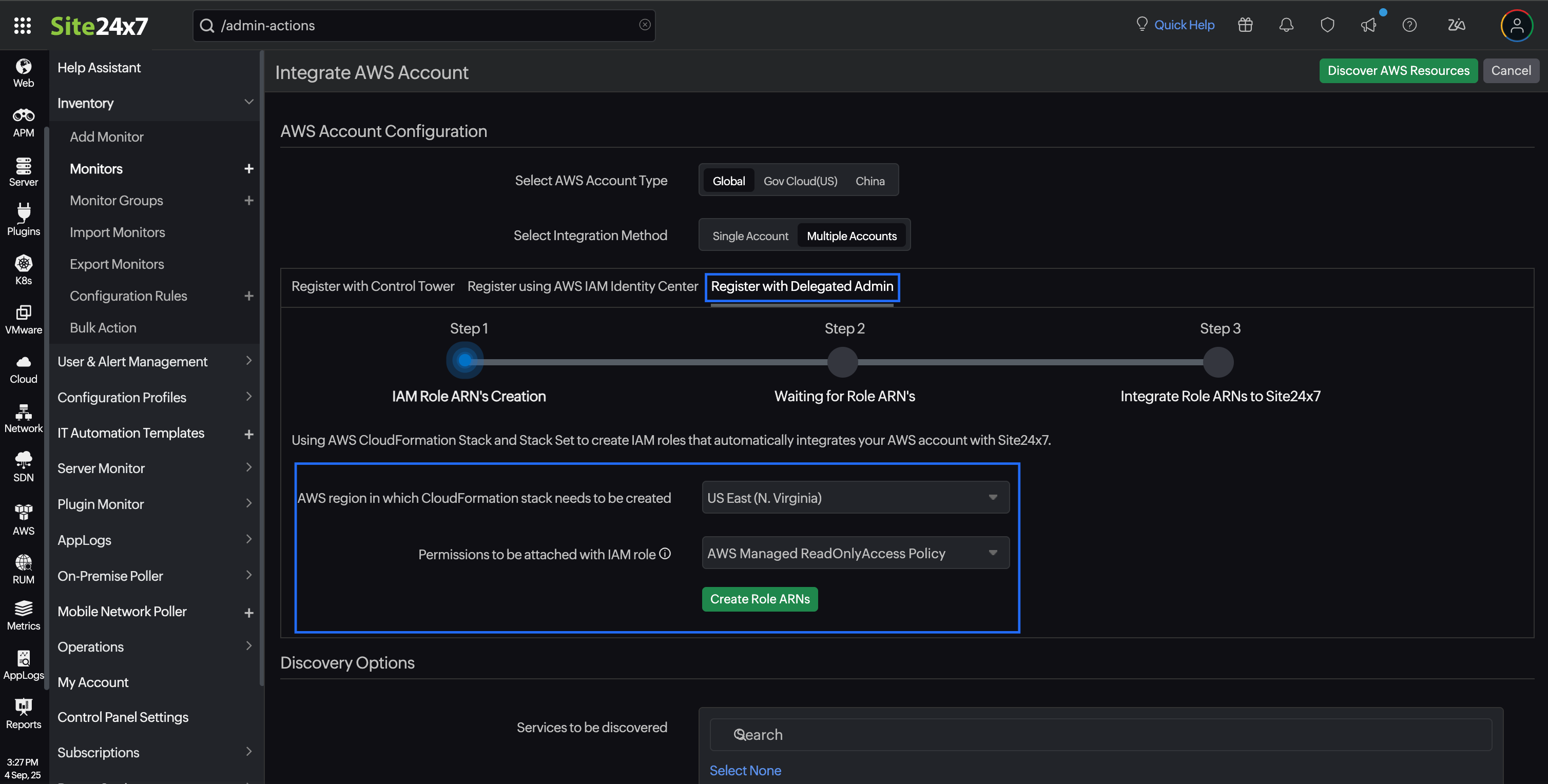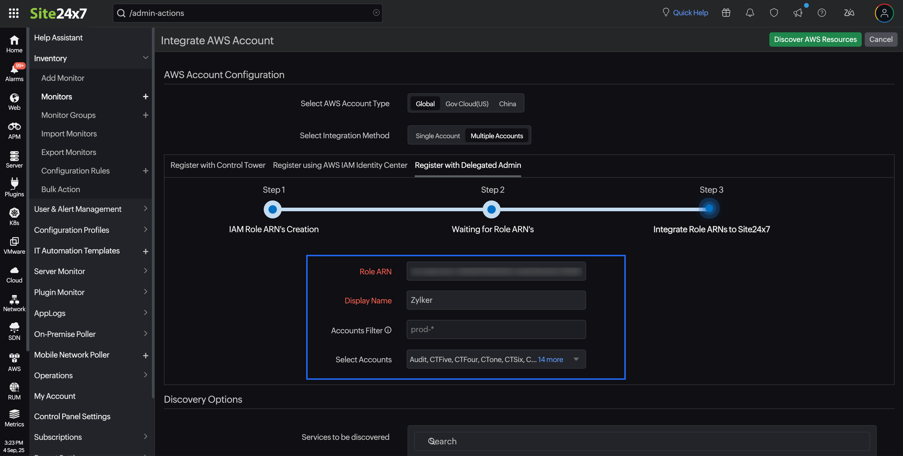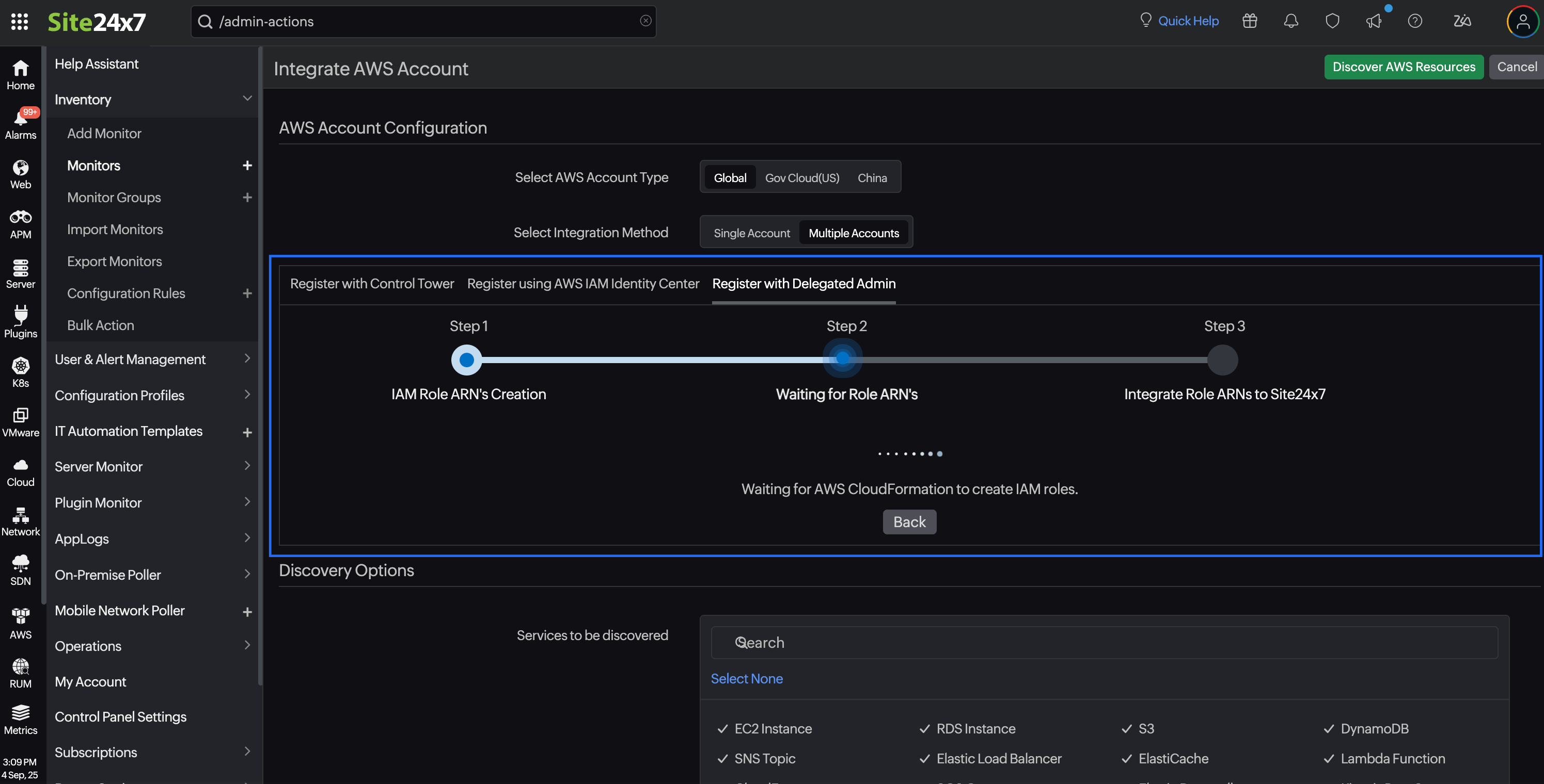 To integrate all your AWS accounts with Site24x7 using the Delegated Admin method, follow the steps below: