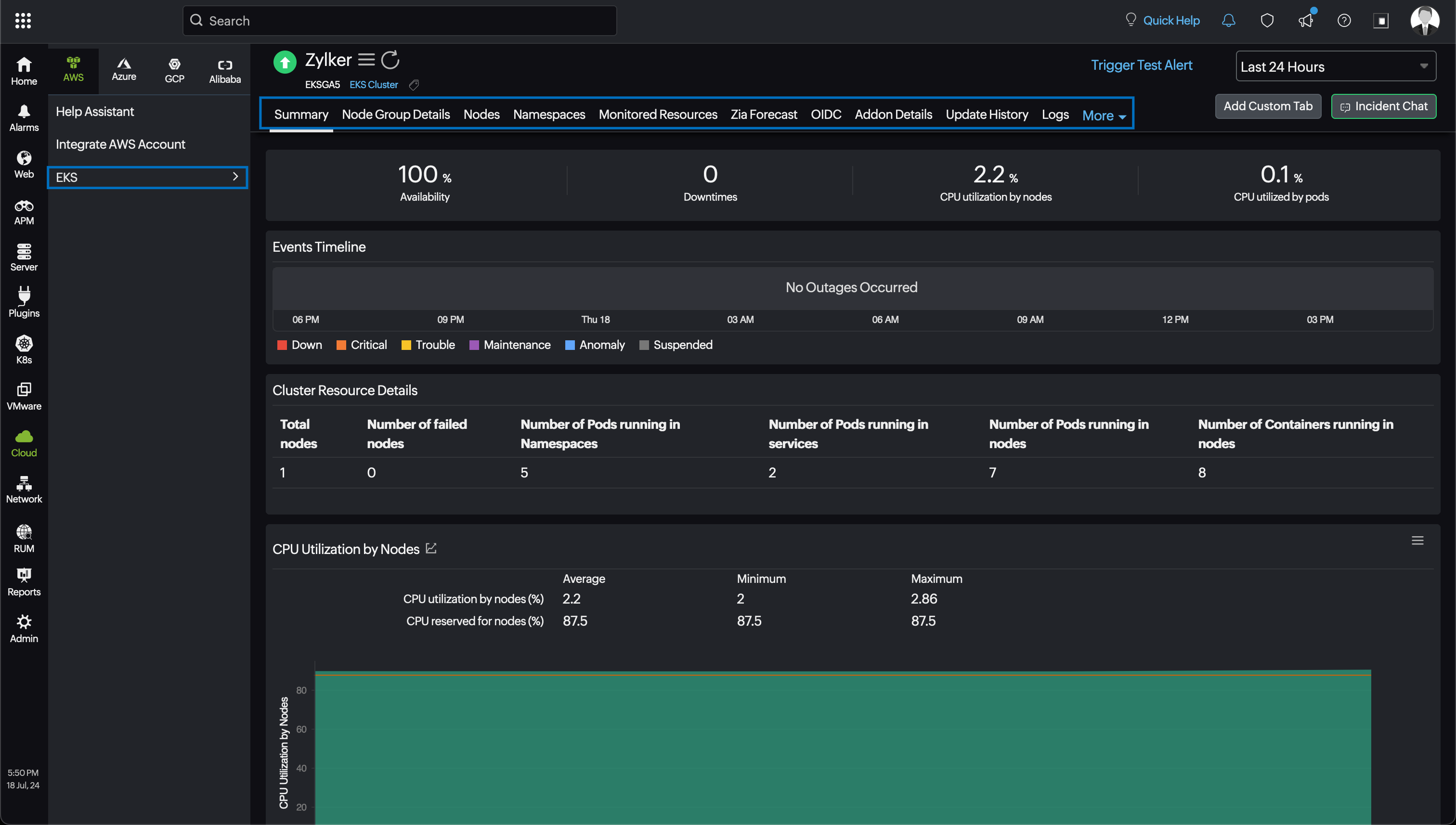 Site24x7's integration with Amazon Elastic Kubernetes Service (EKS) enables you to monitor your Amazon EKS at the cluster, node, and namespace level.