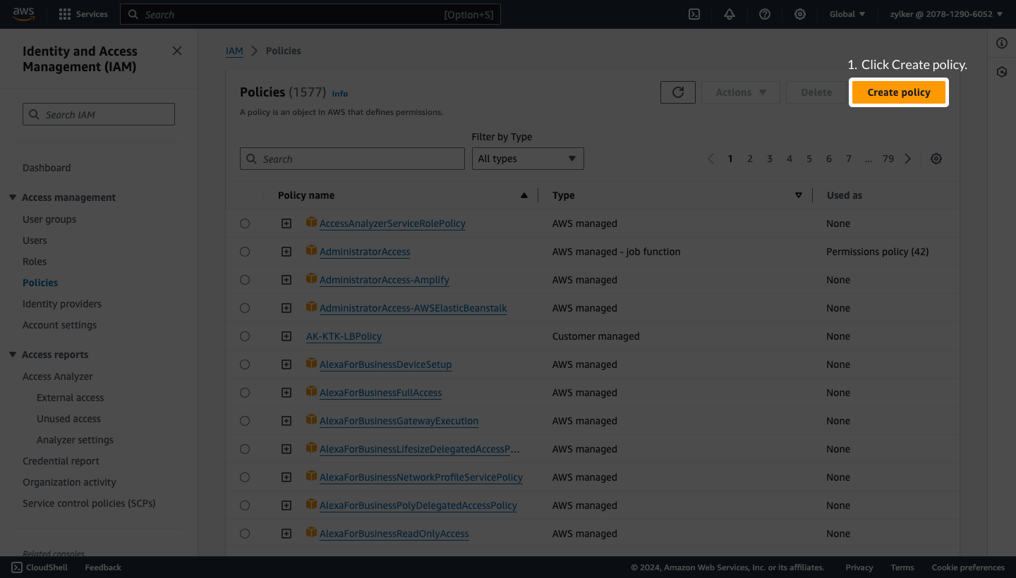1. Log in to the AWS Management Console and open the AWS IAM console.
