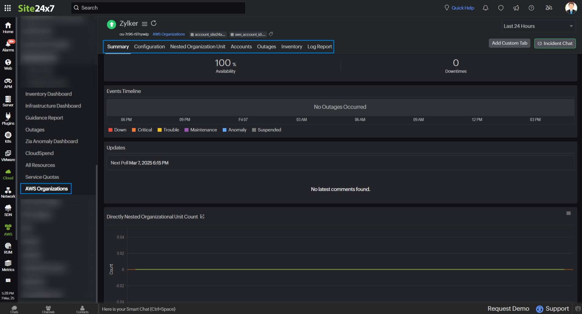Integrating your AWS Organizations with Site24x7 provides real-time insights into your organization's account structure and helps maintain its reliability, performance, and security.