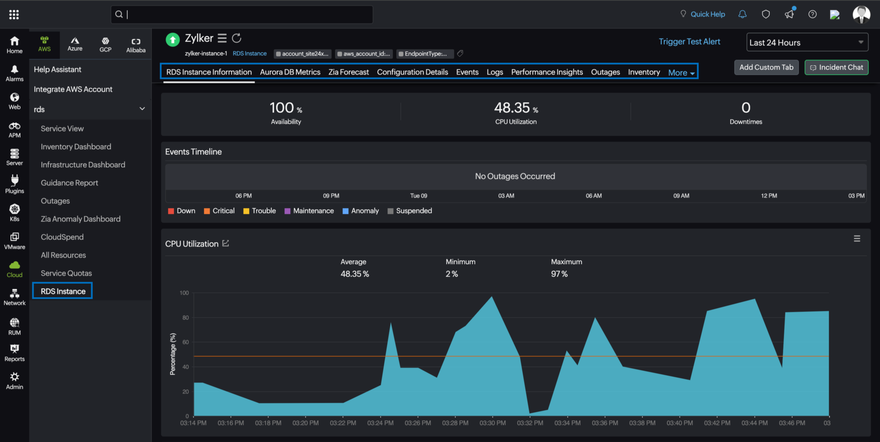 Performance Insights is an advanced tool provided by AWS that allows users to gain deep visibility into the performance of their RDS database instances, helping to diagnose performance issues and optimize database operations. Site24x7's RDS Performance Insights monitor helps you monitor and analyze the performance of RDS instances in real-time.