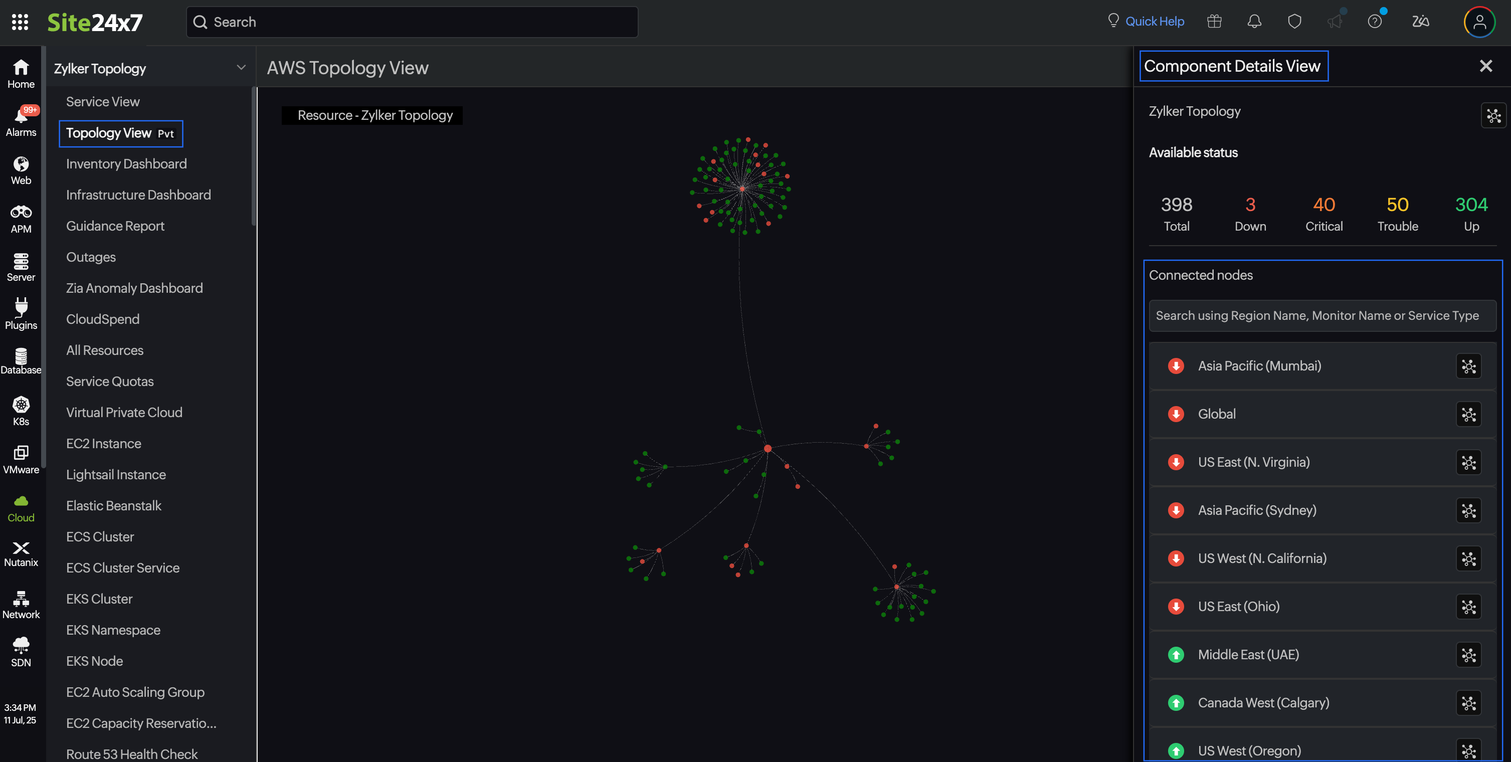 You can zoom in to focus on a region and click on the desired region (like US East or Asia Pacific) in the topology graph to explore it further. Simultaneously, the Component Details View panel on the right side of the screen will display detailed information about the selected region, such as the total number of resources, their health status, and any existing issues.