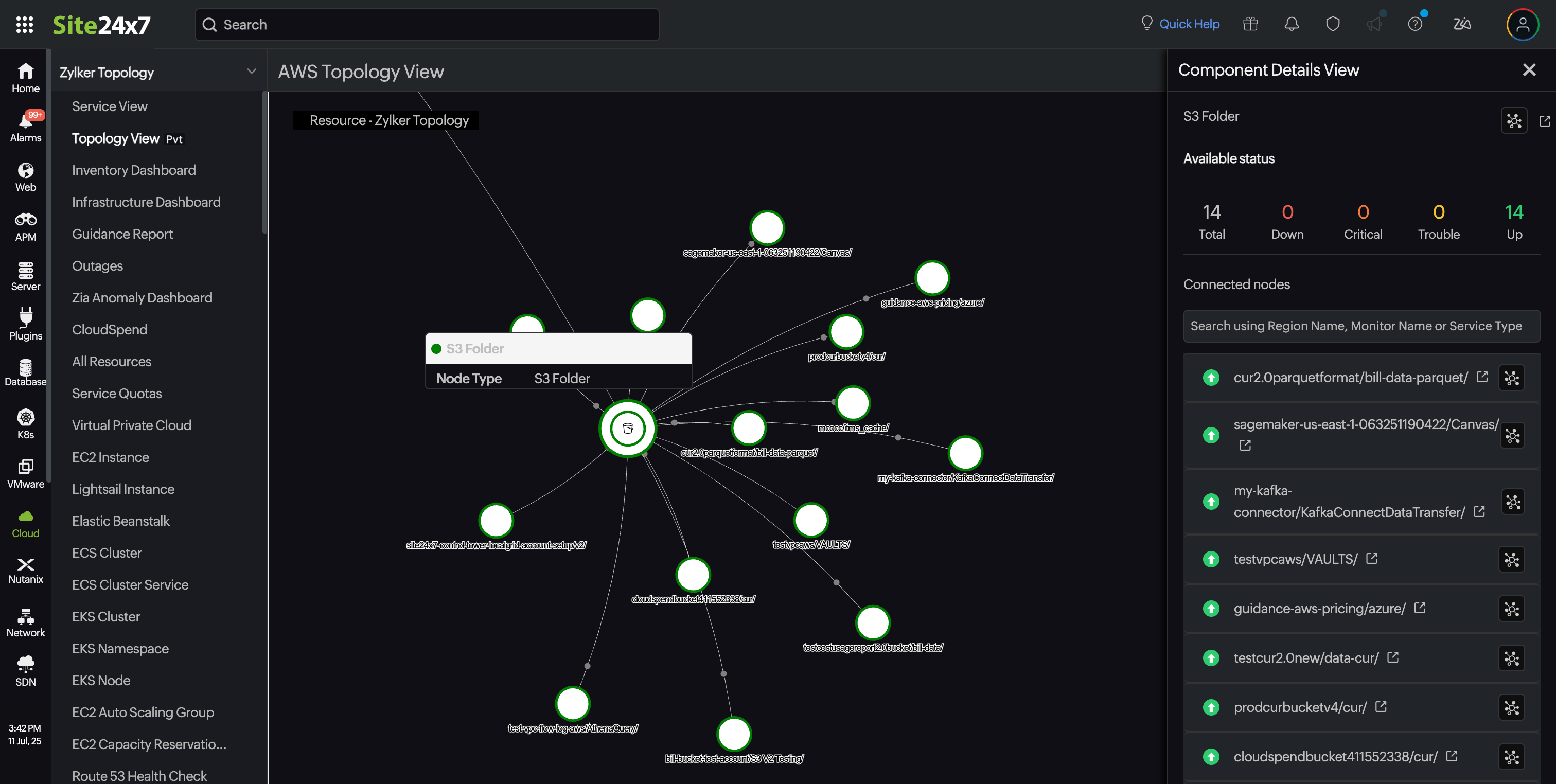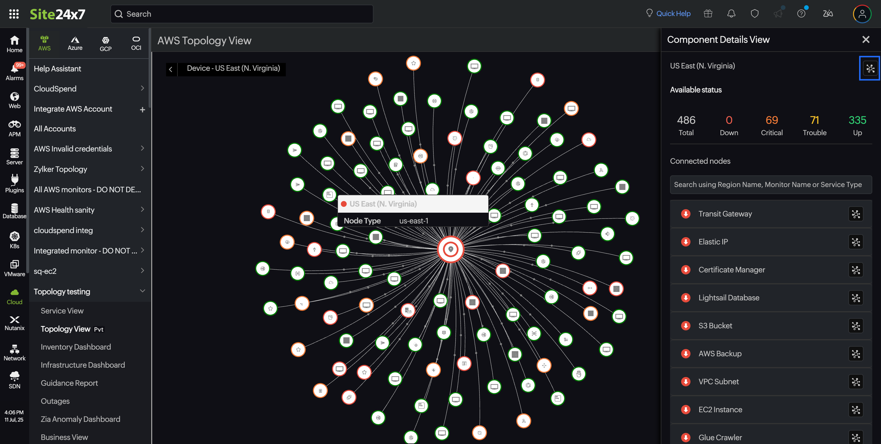 When you click on a node, the Component Details View panel appears on the right side. You can drill down into the specific region or service type. The UI visually shifts focus to that part of the topology, expanding or collapsing views accordingly. This makes root cause isolation faster and more intuitive.