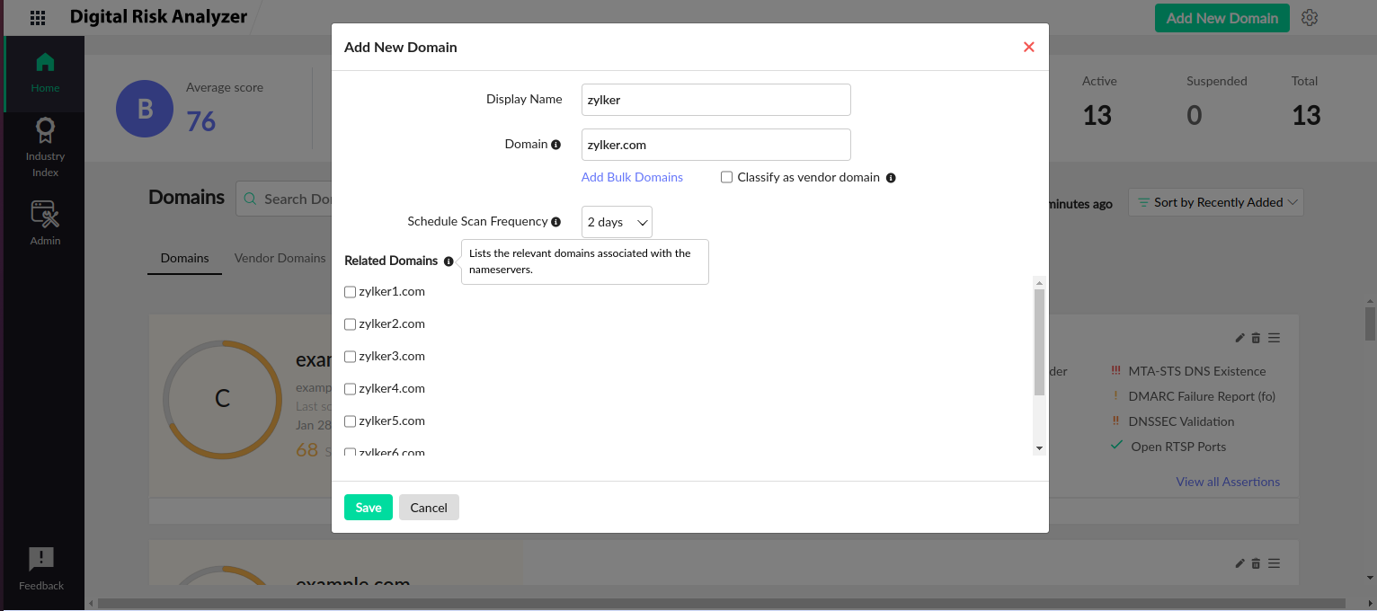 Adding a new domain to Digital Risk Analyzer can help you track the security-related metrics at specific intervals. You can specify your requirements by choosing the required assertions. This can ensure that your domain is free from any vulnerabilities.