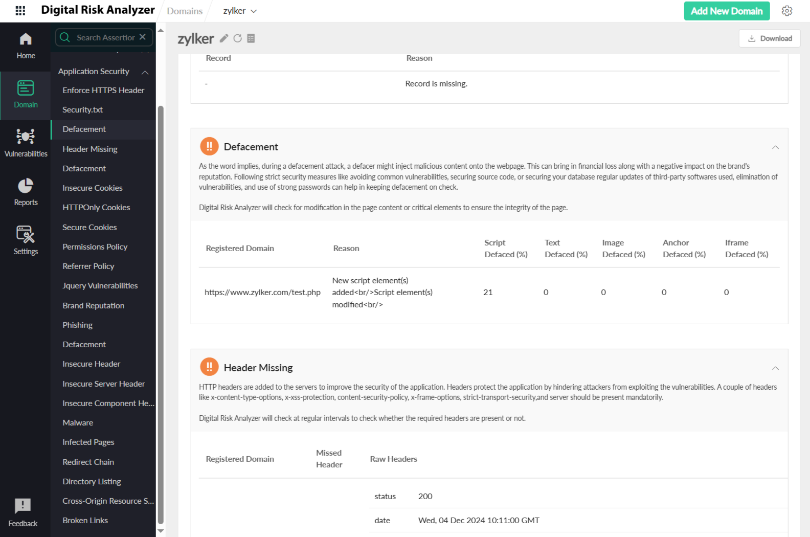Most of the cyber attackers target the vulnerabilities in the application layer. With the enhanced complexity of the application tier, it is essential to test applications for their security. Application security can be ensured by constantly tracking the headers, by checking for any malware injections, defacement attacks, and much more. Here are a few checks that Digital Risk Analyzer will run to ensure that your application is secure.