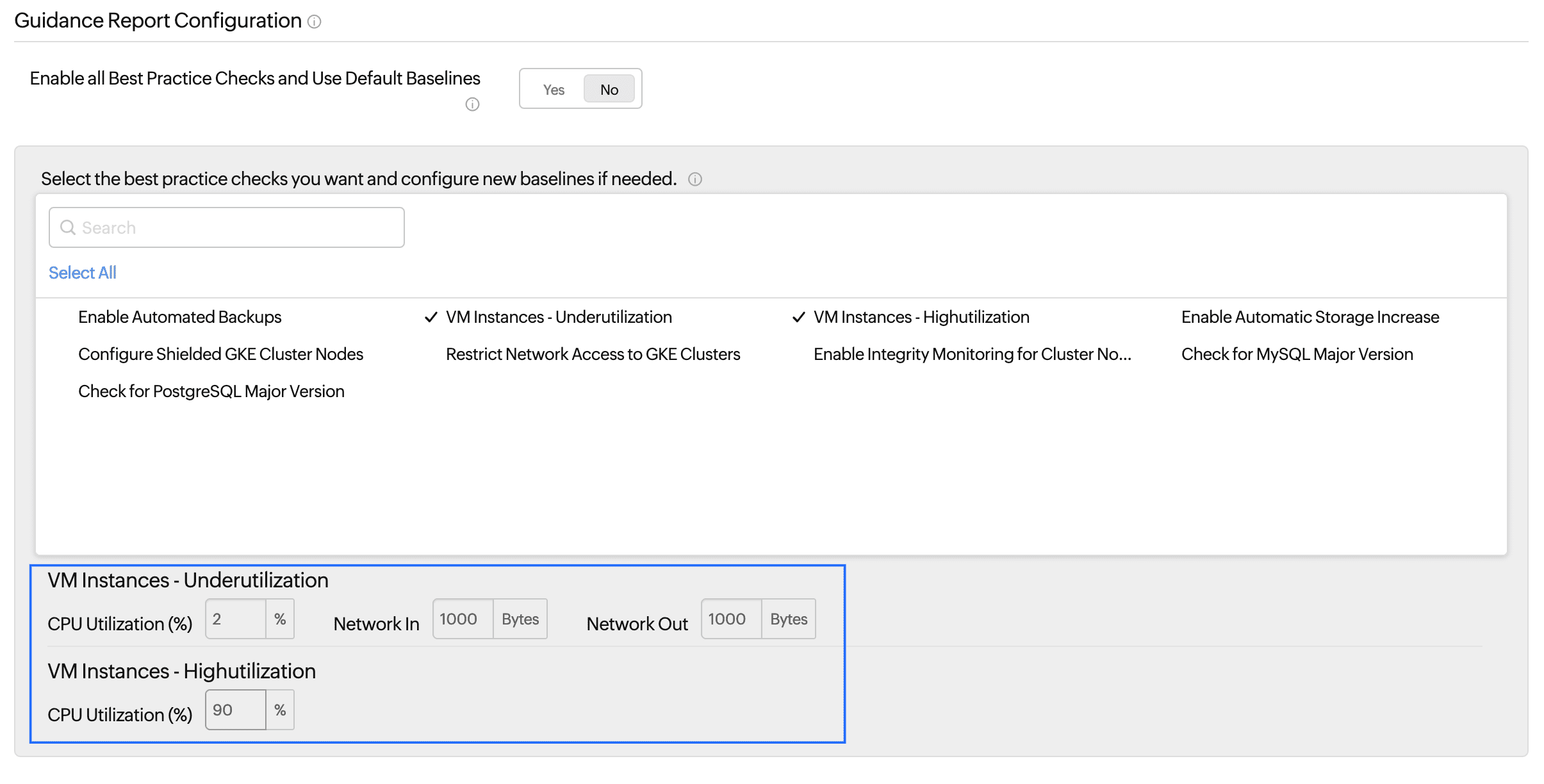 Site24x7's Guidance Report analyzes your GCP account using our best practice recommendation checks and provides insights to reduce costs and improve performance. If you want to enable all checks and use default baselines, keep the toggle at Yes. If you're going to choose the recommendations and configure custom baselines (only applicable for the following checks: VM Instances - Underutilization and VM Instances - Highutilization) toggle the option to No. -