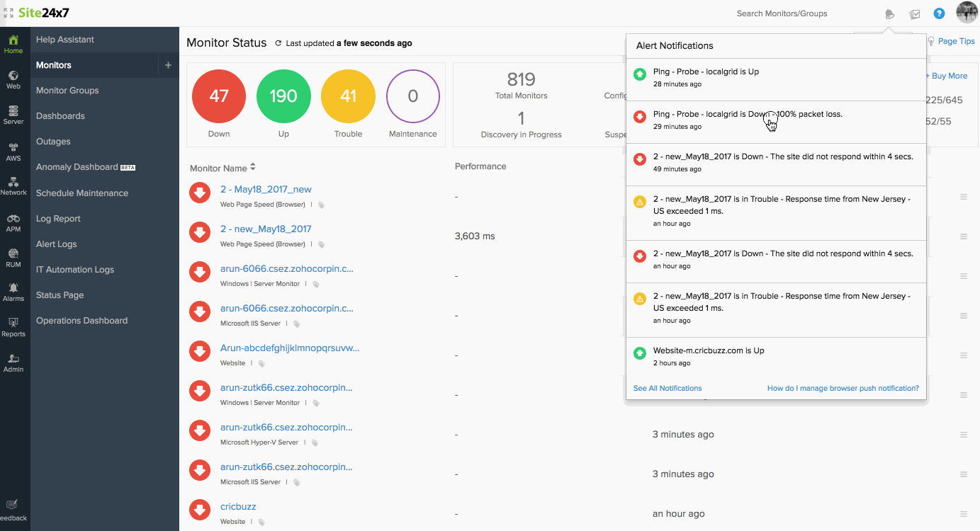 All monitors will now be smartly categorized into various segments according to their current operational status right in your home screen to give you a better understanding of your monitor's performance. Down/trouble monitors are grouped in red. Blue identifies monitors with any configuration errors. Monitors that are under maintenance are grouped under purple. All available monitors are shown in green. Further, each configured monitor's response time (in ms) along with its last polling time is also listed in this report.
