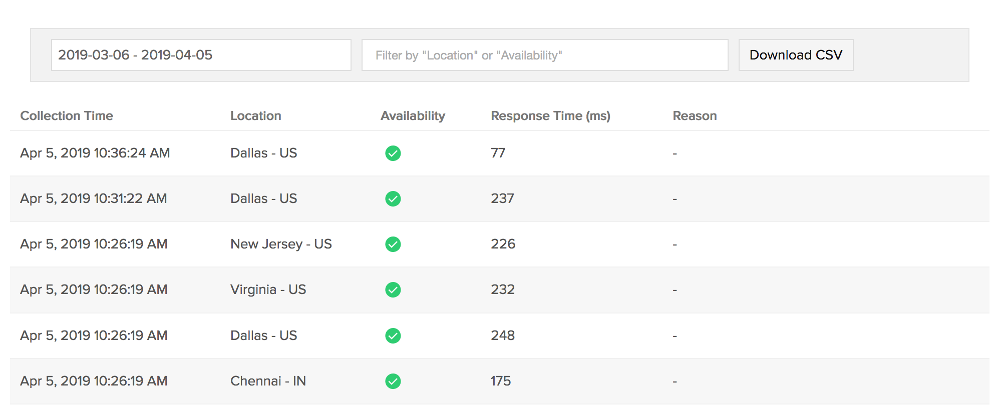 With our integrated log records for individual monitors, you can get an indepth knowledge about the various log details for the configured monitor, over a custom period. You can also filter the log based on location and availability. You have an option to download the log report in CSV format.